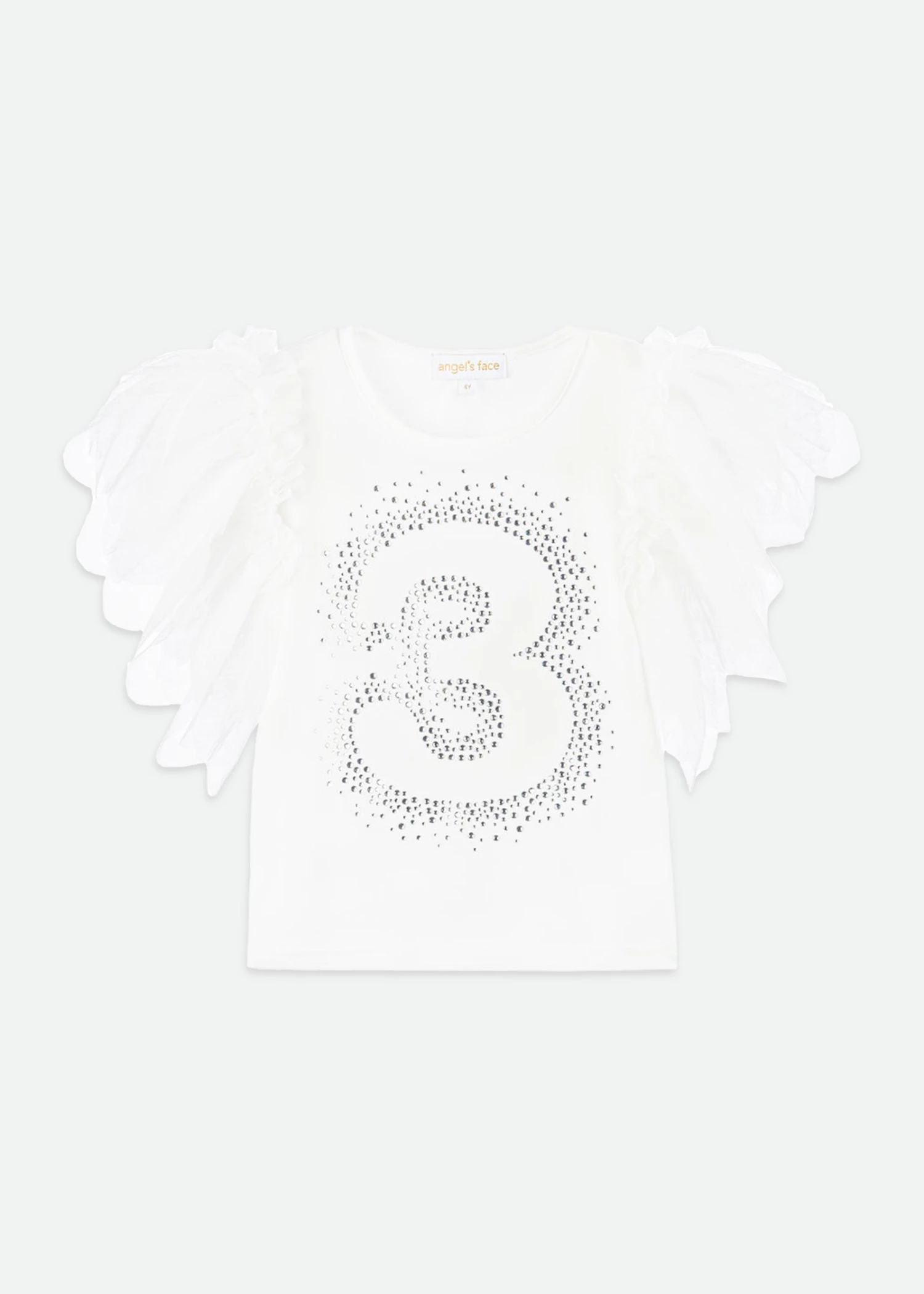 Beautiful snowdrop white top with soft petal tulle sleeves made from a super soft cotton blend. Featuring gorgeous diamante hot stone number 3 design on the front so any birthday girl can stand out.