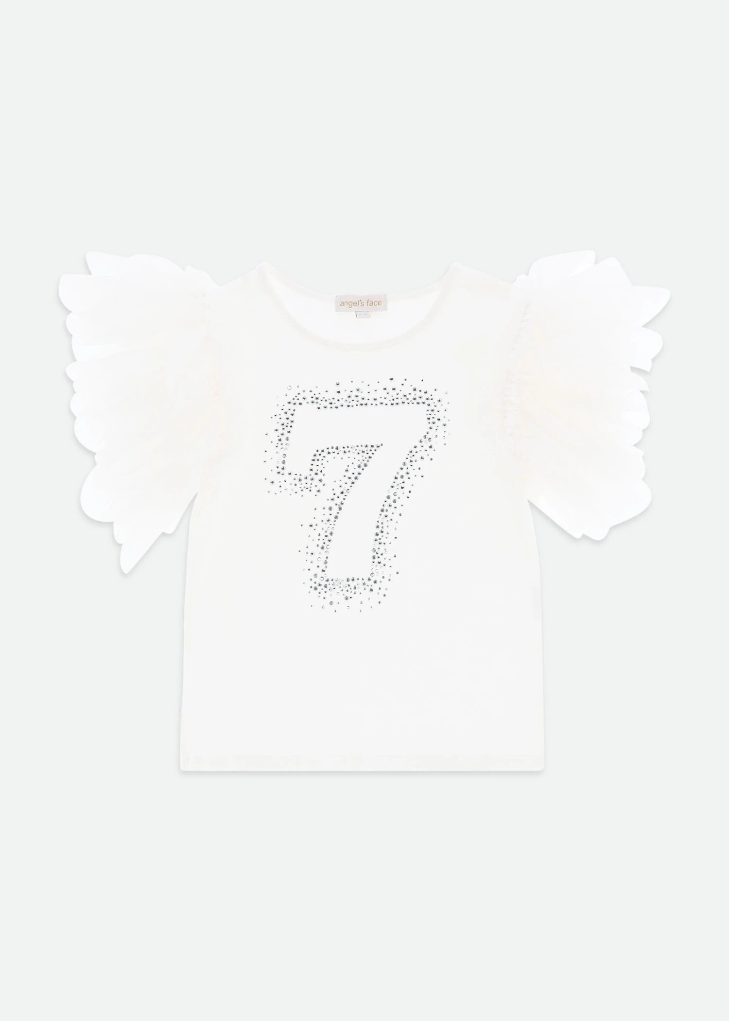 Beautiful snowdrop white top with soft petal tulle sleeves made from a super soft cotton blend. Featuring gorgeous diamante hot stone number 7 design on the front so any birthday girl can stand out.