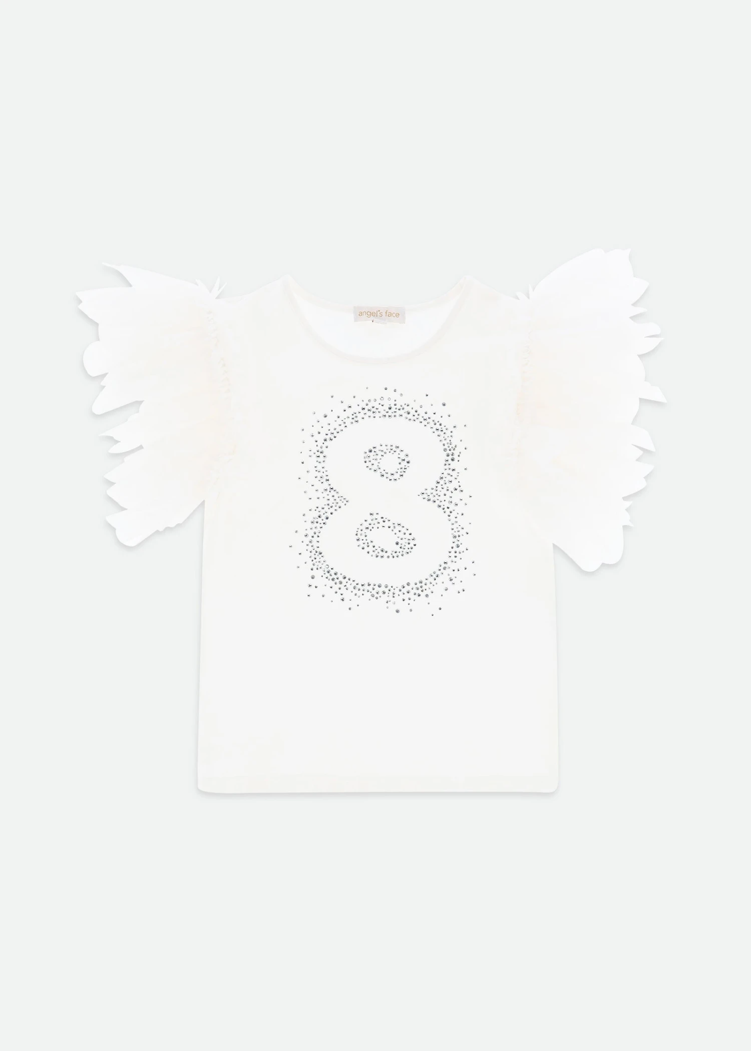 Beautiful snowdrop white top with soft petal tulle sleeves made from a super soft cotton blend. Featuring gorgeous diamante hot stone number 8 design on the front so any birthday girl can stand out.