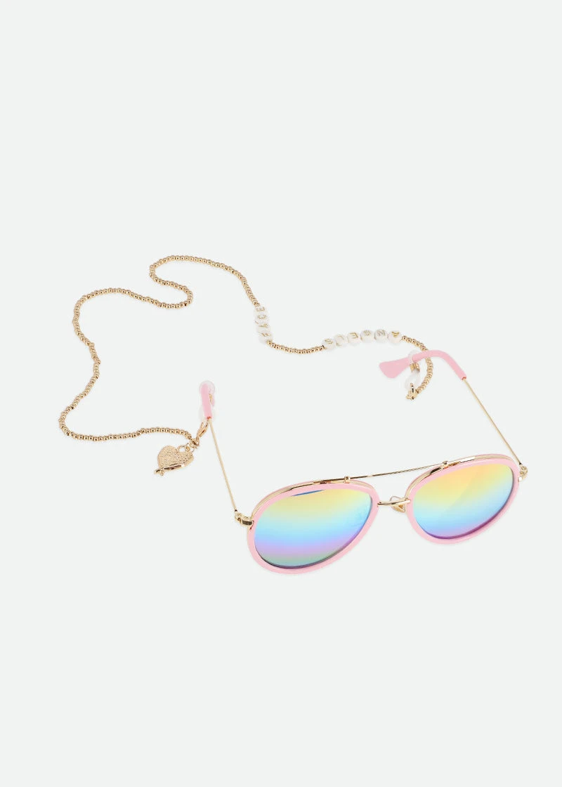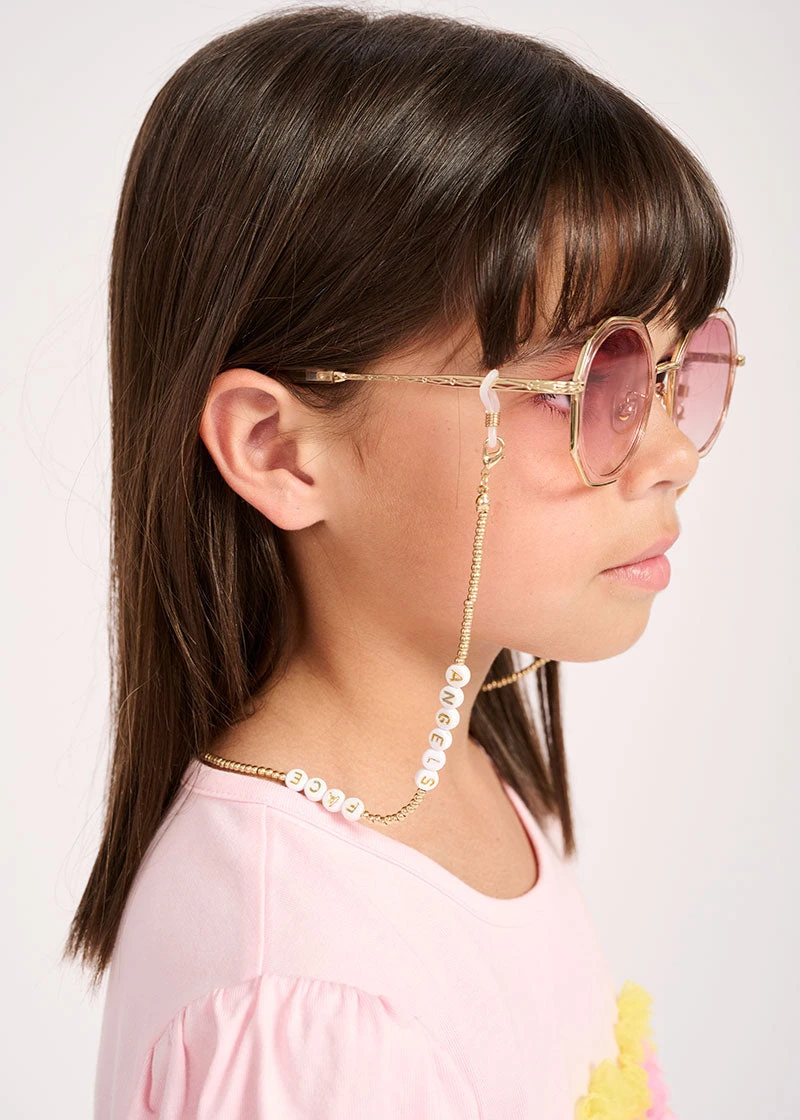 Two in one gold bead necklace and sunglass chain complete with Angel’s Face pendant. The ultimate summer accessory! (Sunglasses not included)