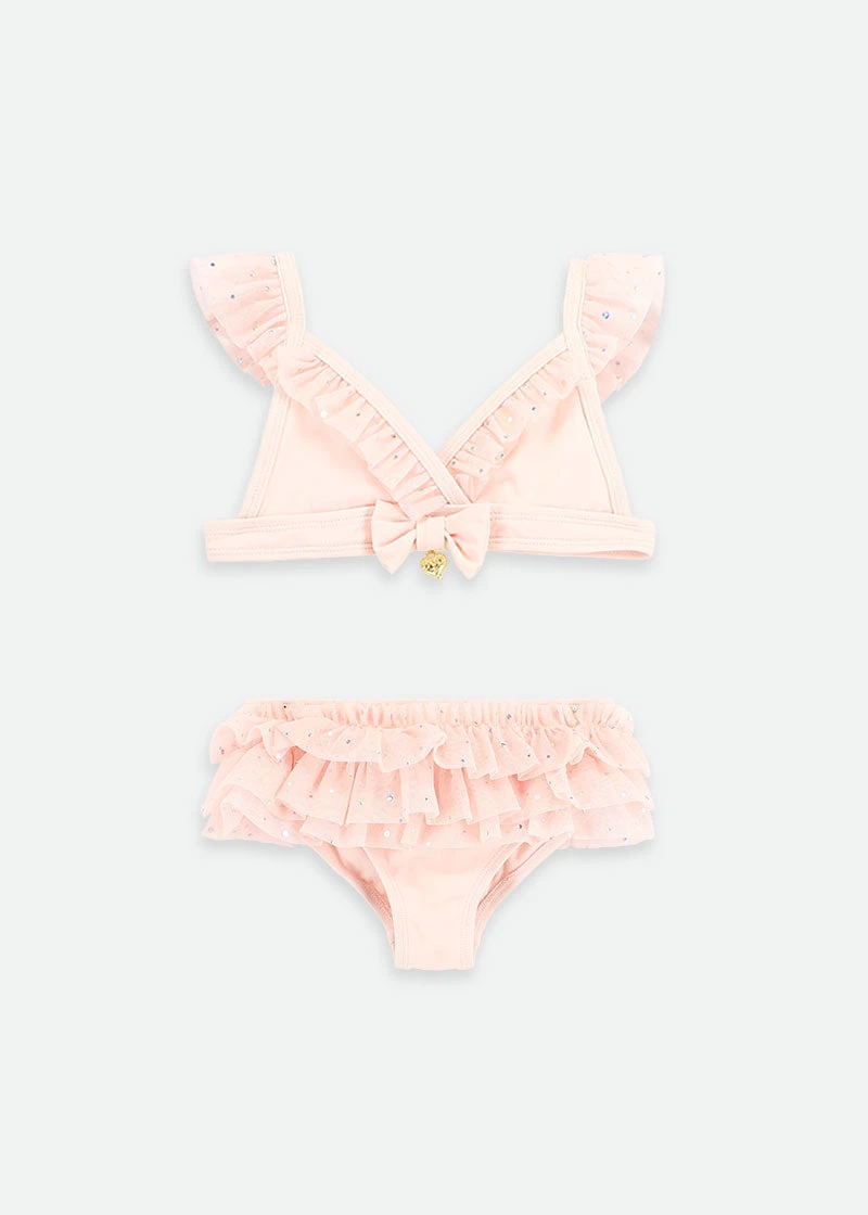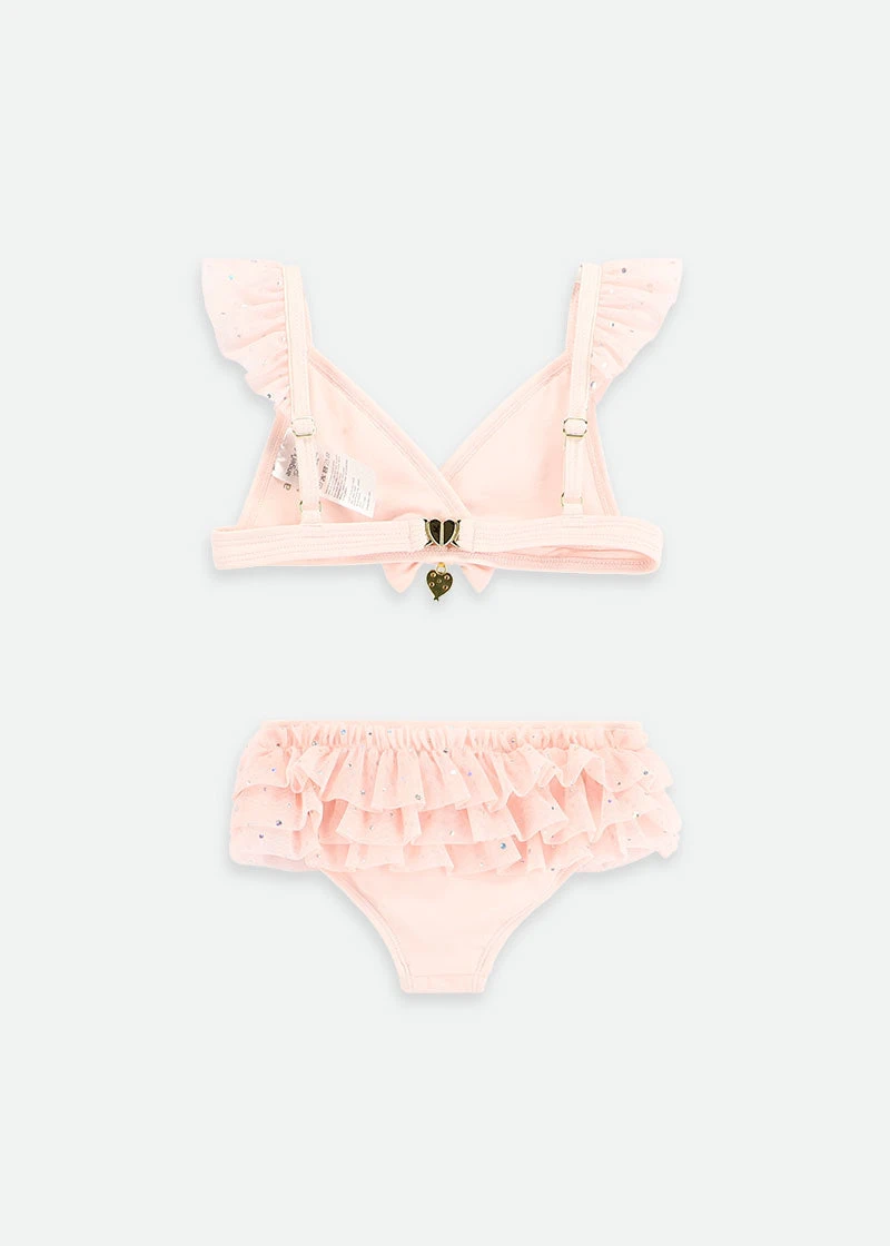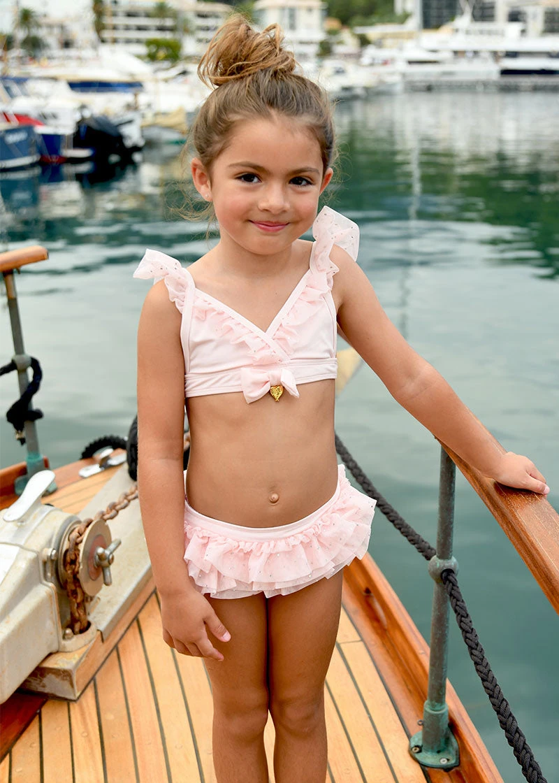 Swim in style this summer with our gorgeous pale pink bikini for girls. Details include sparkled ruffle edging, easy halter neck fit and decorative bows featuring our signature gold heart charm. Swimwear is fully lined and made from SPF 50 fabric for optimum sun protection.