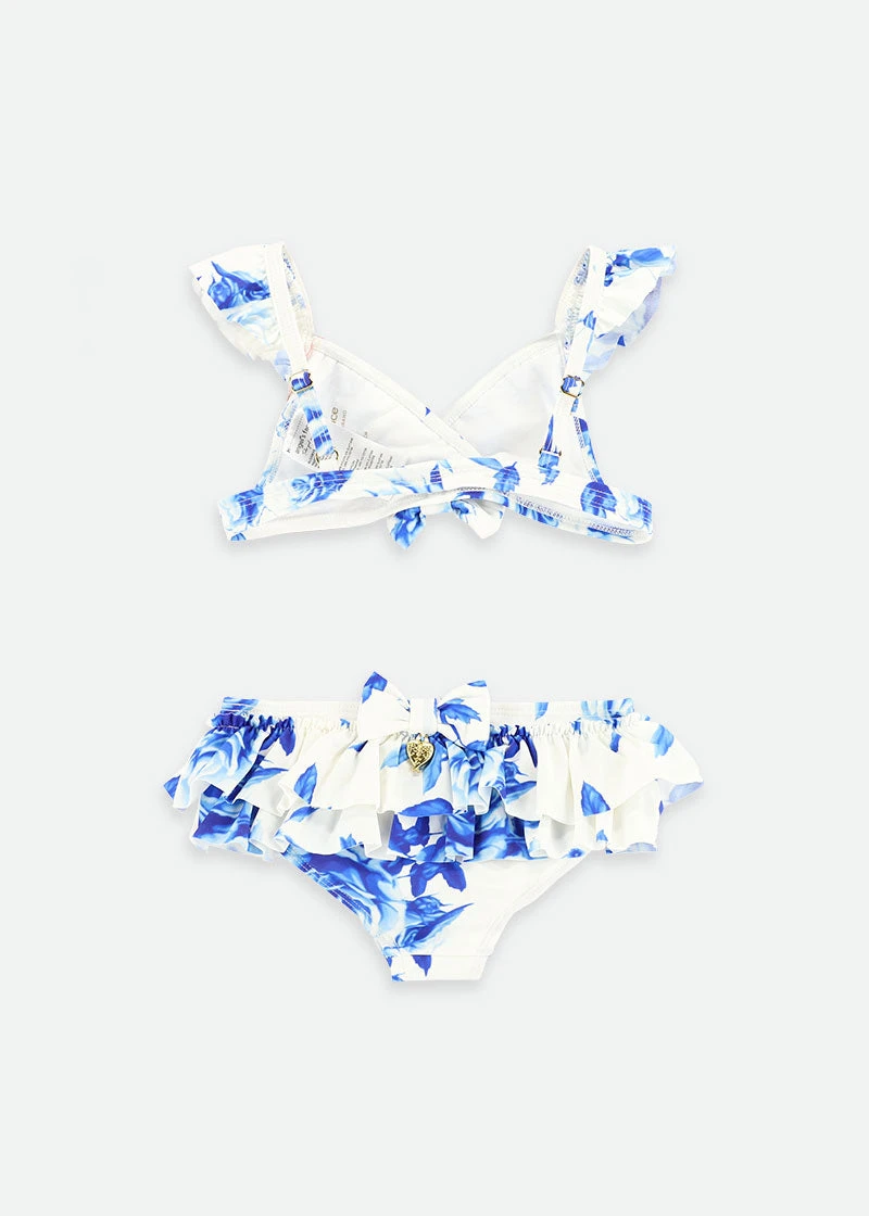 Swim in style this summer with our gorgeous, white with blue rose design, bikini for girls. Details include pretty ruffle edging, easy halter neck fit and decorative bows featuring our signature gold heart charm. Swimwear is fully lined and made from SPF 50 fabric for optimum sun protection.