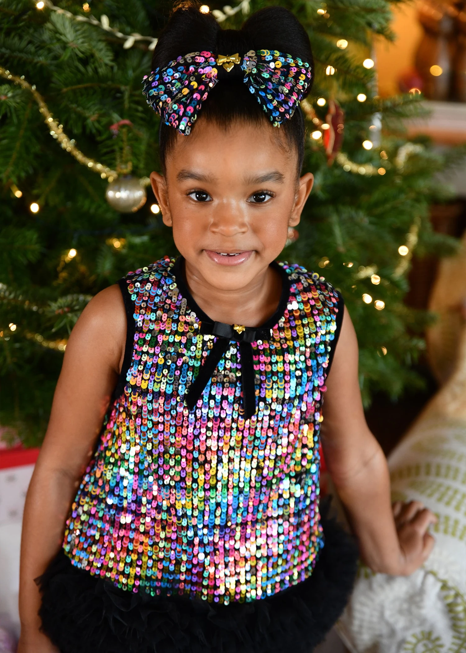 Fun and fabulous multicolour sequin set for girls. The sleeveless top is covered in vibrant sequins for a sparkling statement look, finished with a dramatic tulle hem and a velvet bow with the Angel’s Face signature gold heart charm. Fully lined in soft cotton blend for comfort. The matching black flared trousers are made in a soft, stretchy fabric for easy movement and style.