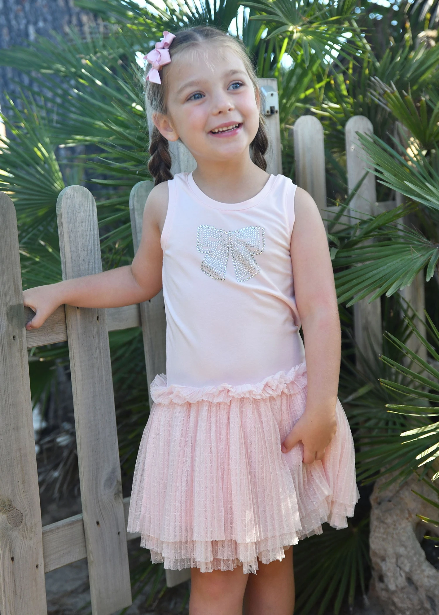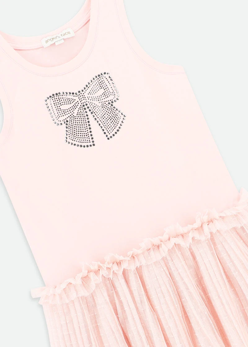 Sparkle in this pale pink sleeveless summer dress. Made in a comfortable cotton blend, featuring voluminous layers of soft spotted tulle. This dress has a pretty bow diamanté embellishment on the front.
