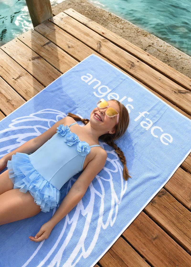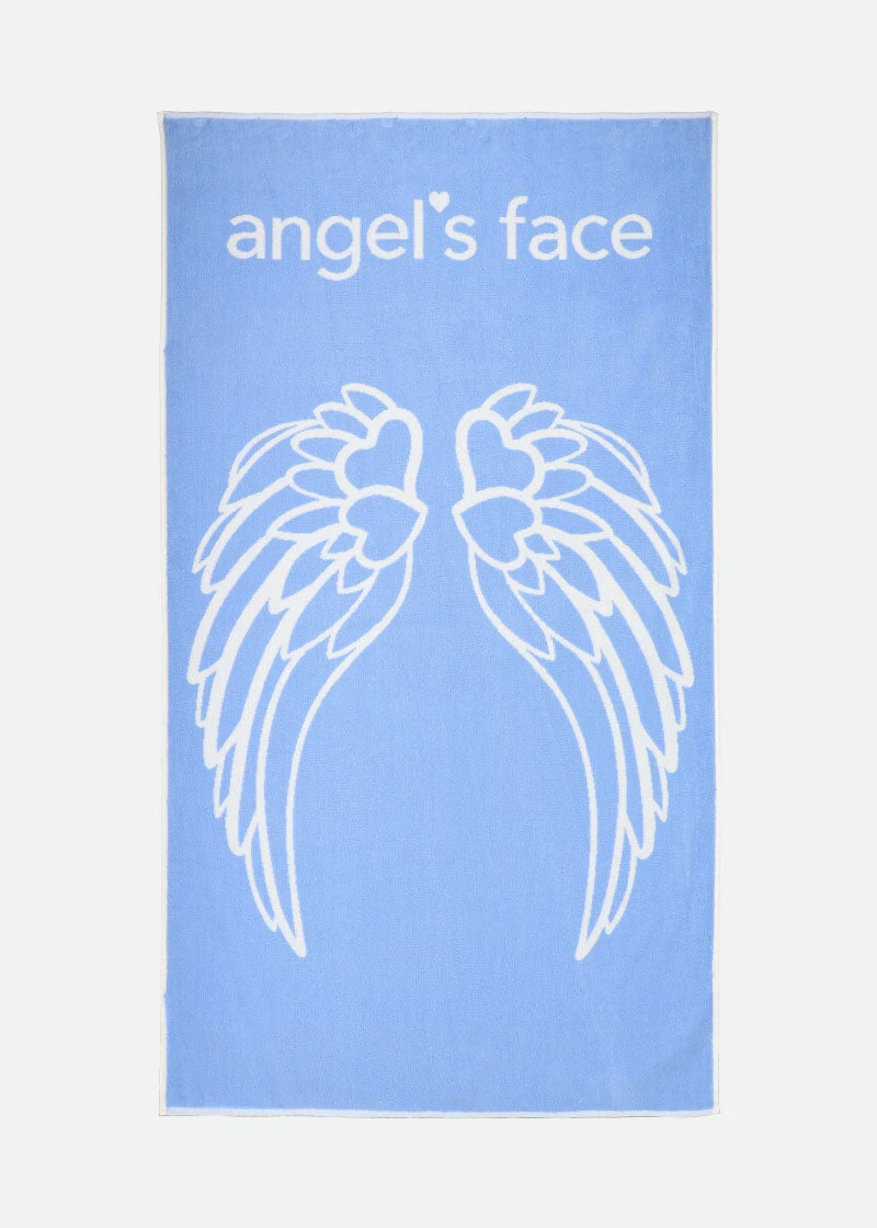 Large, extra soft, absorbent cotton beach towel in pastel blue with our signature logo and wings, made to match your favourite Angel’s Face swimsuit. On the reverse is a towelling underside that’s fully absorbent. Take to the beach or pool and wear it with our co-ordinating Adel and Cleopatra bikini and our Darcey and Rene swimsuits.