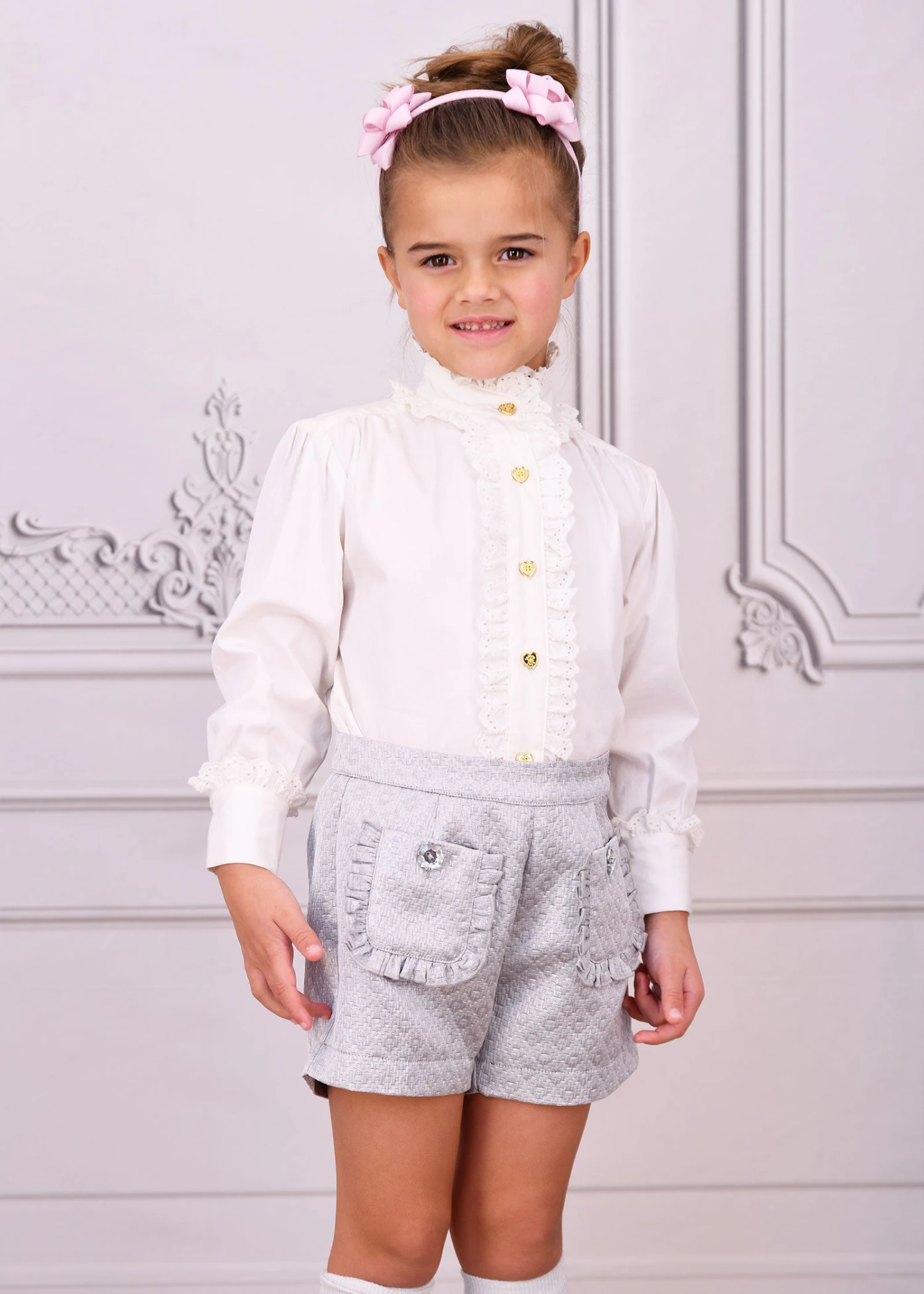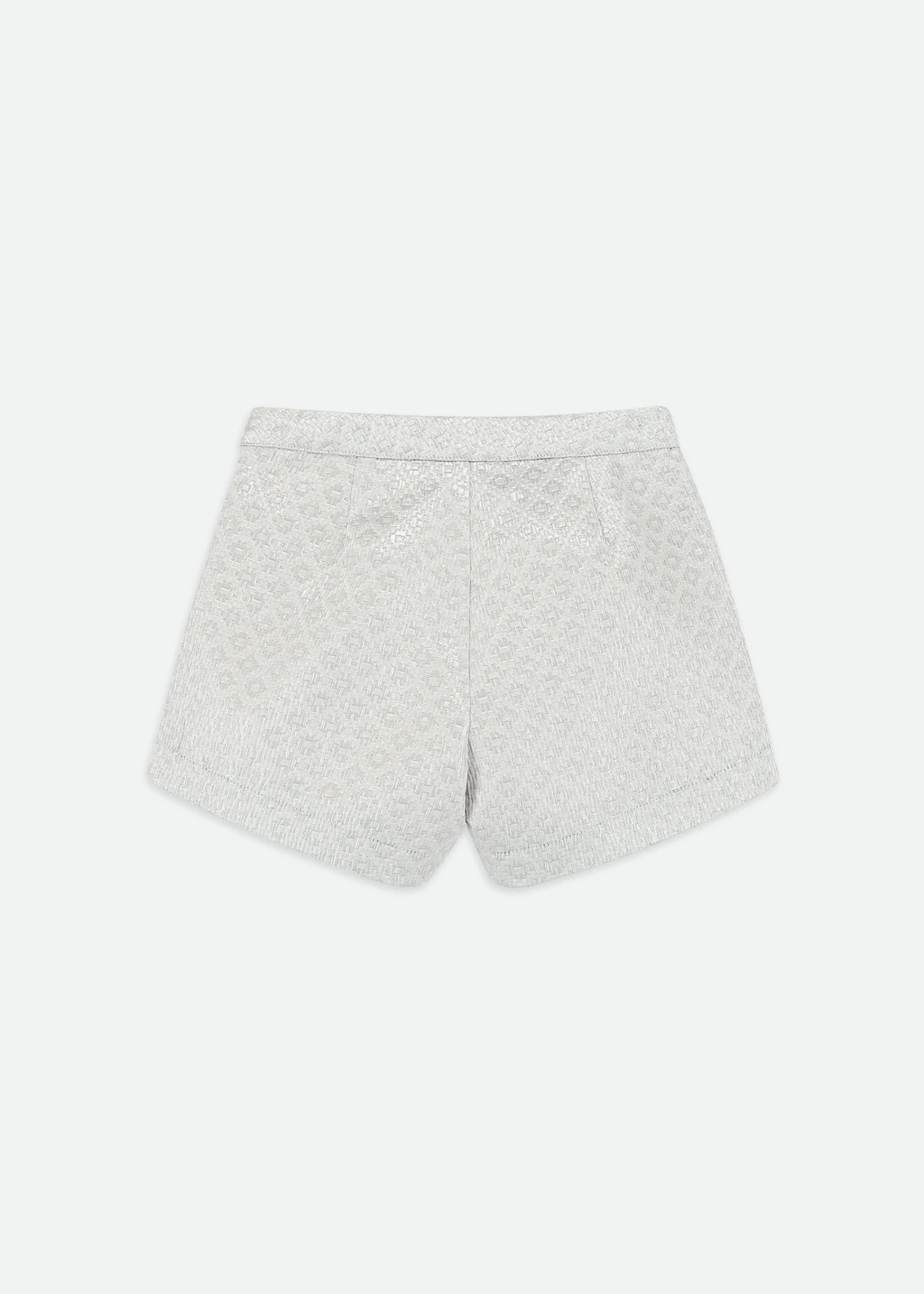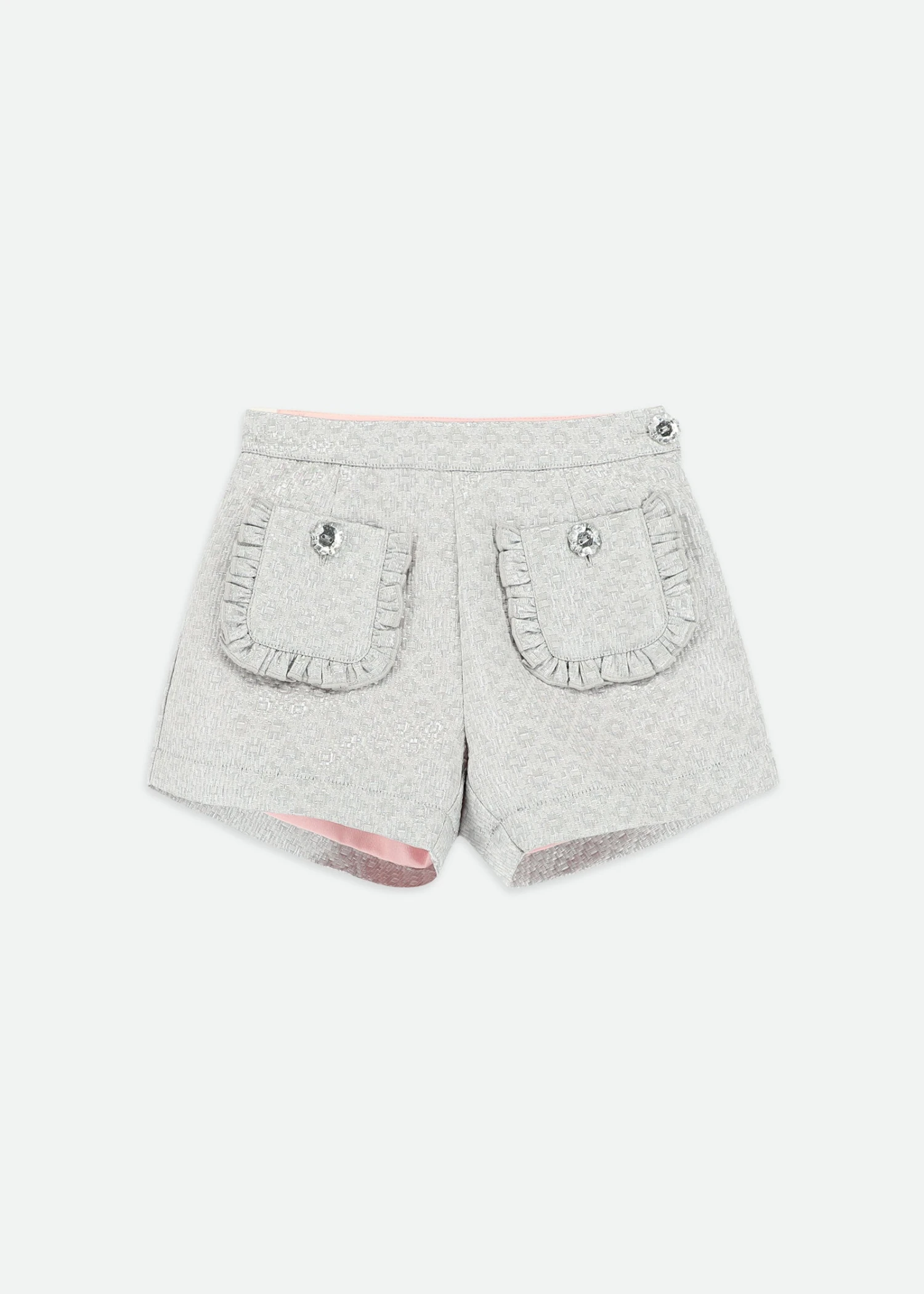 Add a touch of sparkle to her wardrobe with these platinum jacquard shorts for girls. Made in a soft, stretchy fabric with a subtle shimmer, they feature two front pockets trimmed with pretty ruffles and dazzling diamanté buttons. The comfortable elasticated waistband ensures an easy fit, and a smooth pink lining feels soft against the skin. Perfect for dressing up or wearing every day.