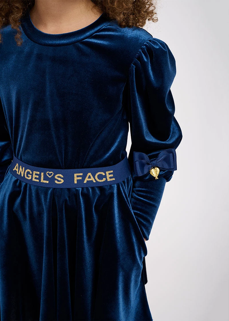 Playful velveteen skater skirt in navy blue. Comfortable in fit and soft to touch, skirt is complete with an elasticated waistband featuring Angel’s Face in gold lurex thread.