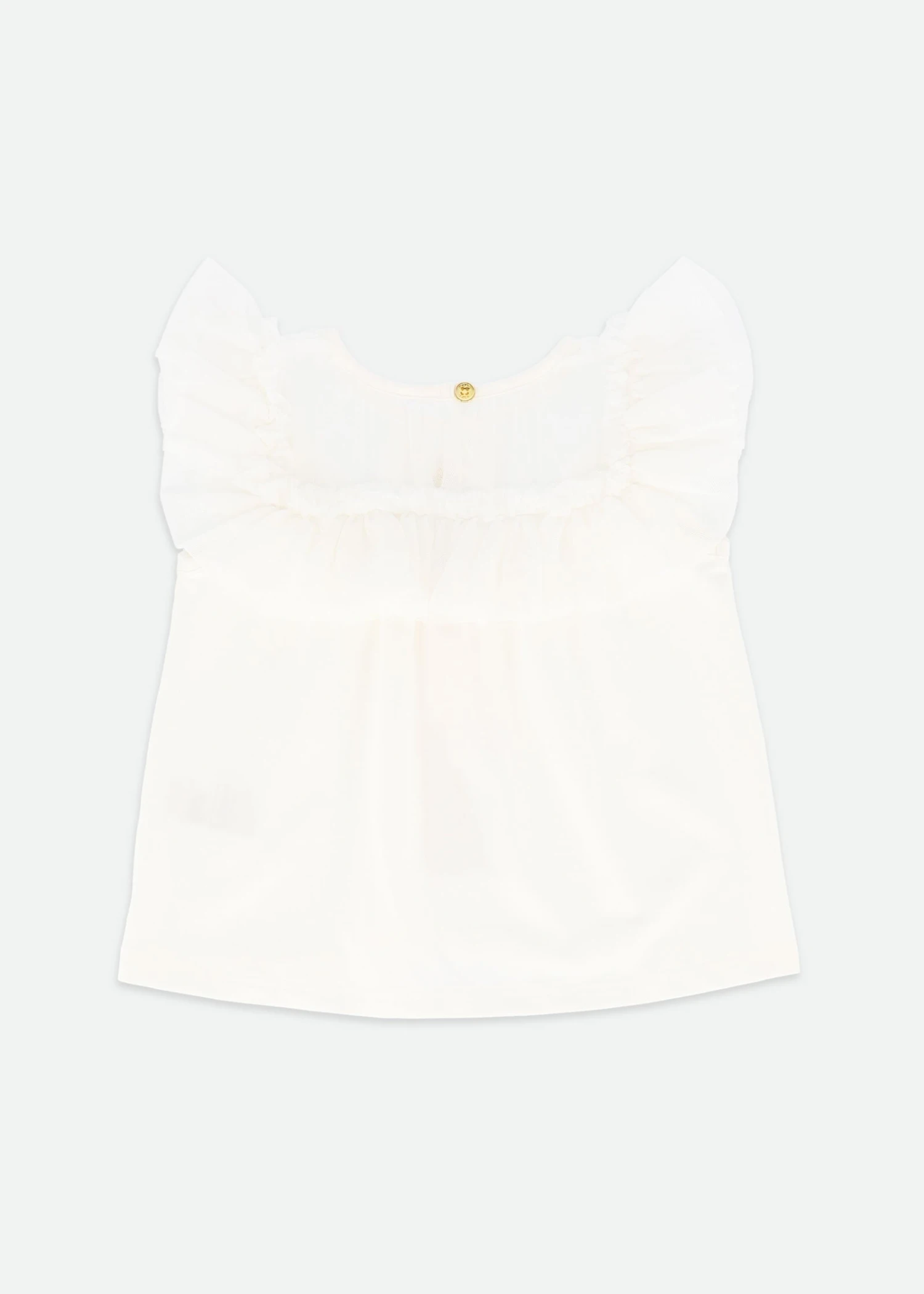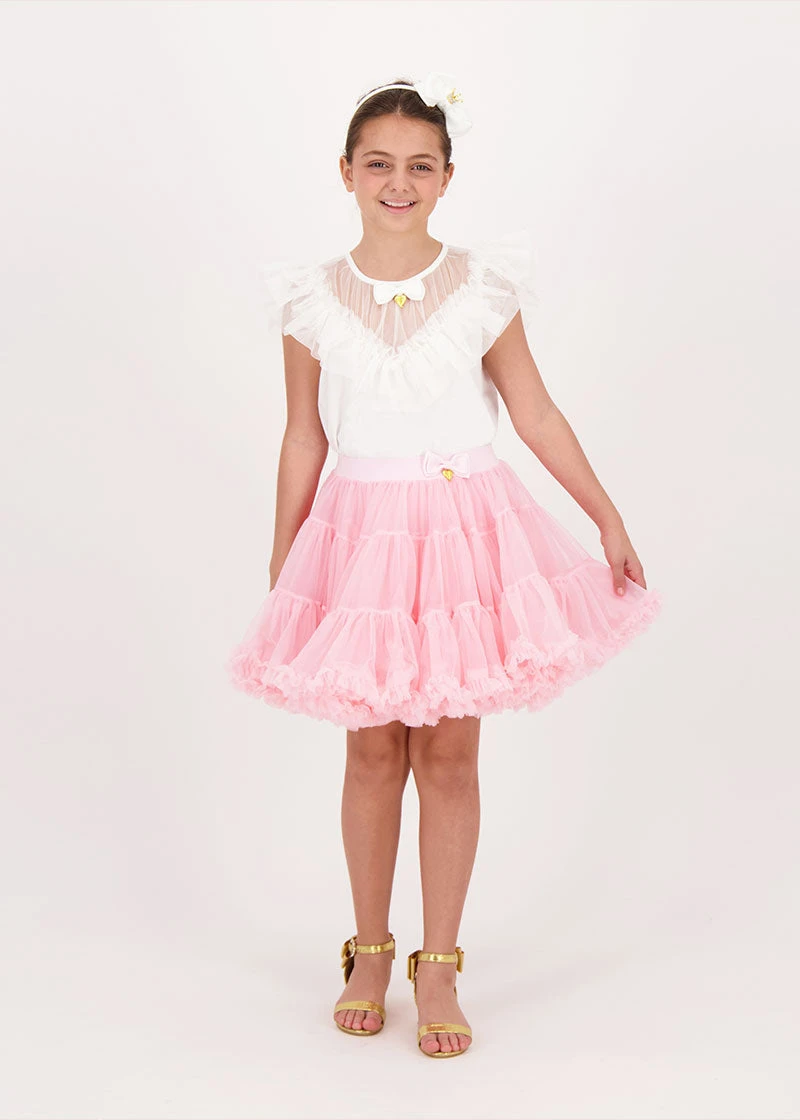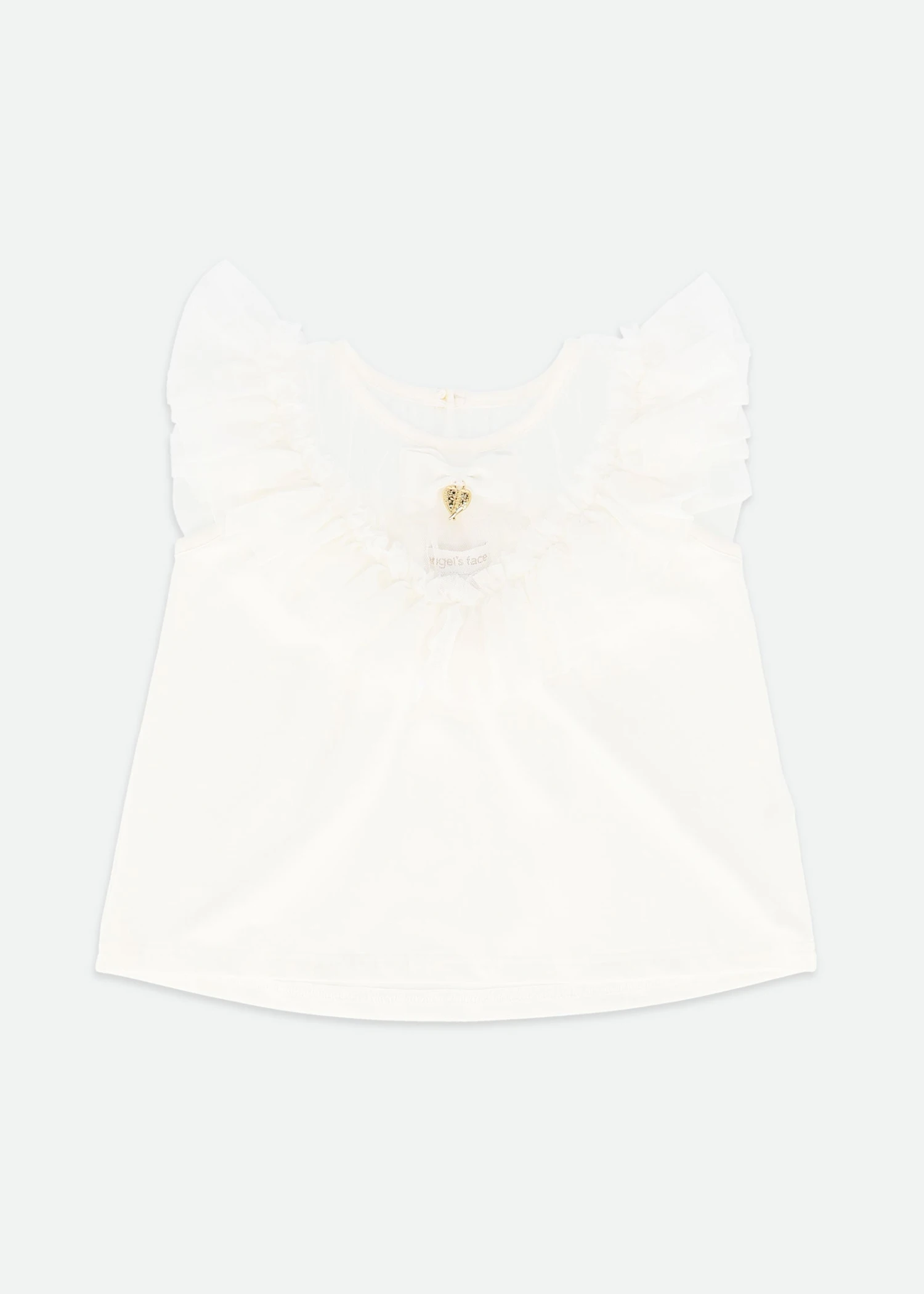 Stunning top in snowdrop with beautiful tulle yoke complete with ruffle detail. Made with a super soft on the skin cotton blend. Featuring our signature Angels Face bow and gold heart charm.