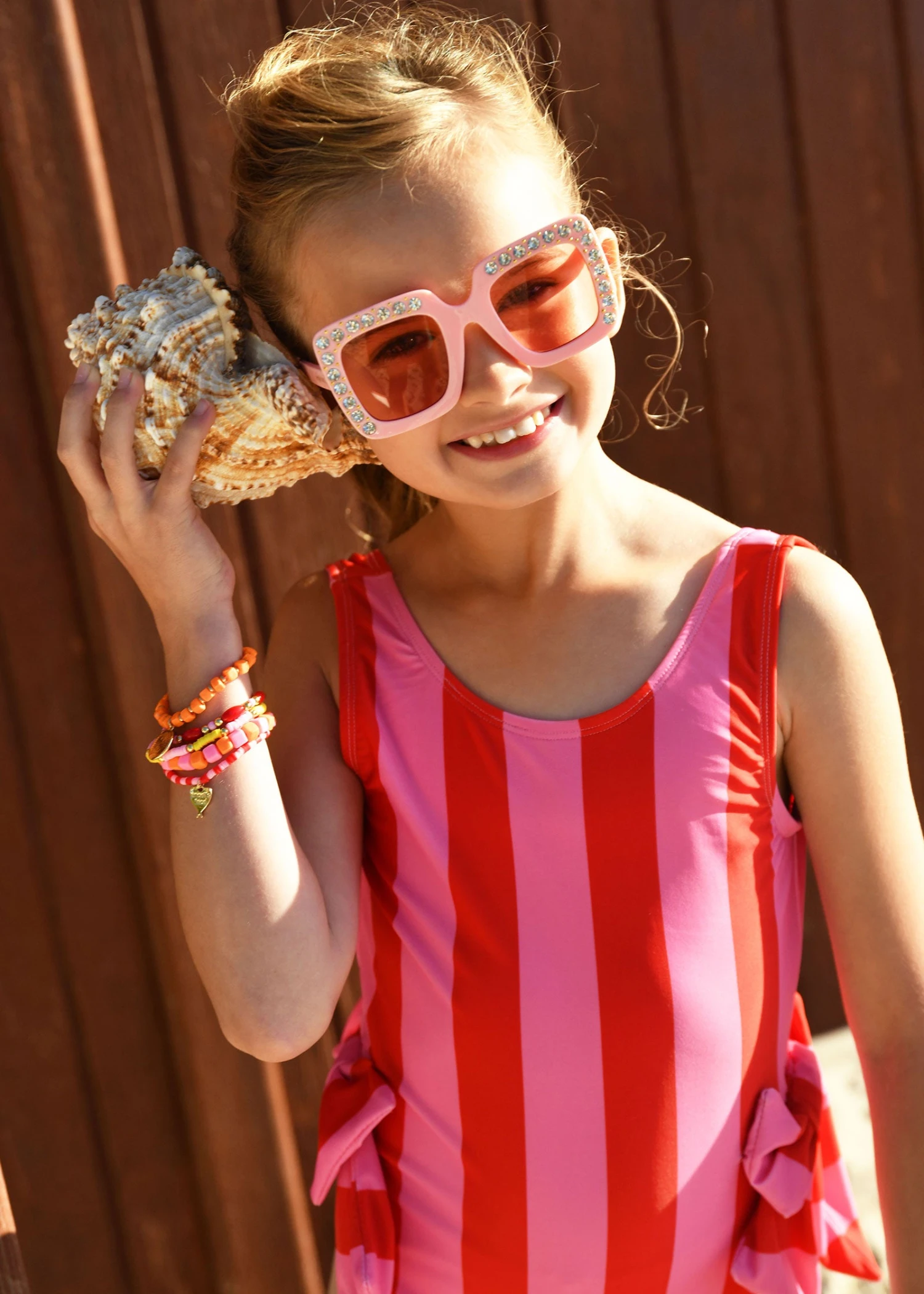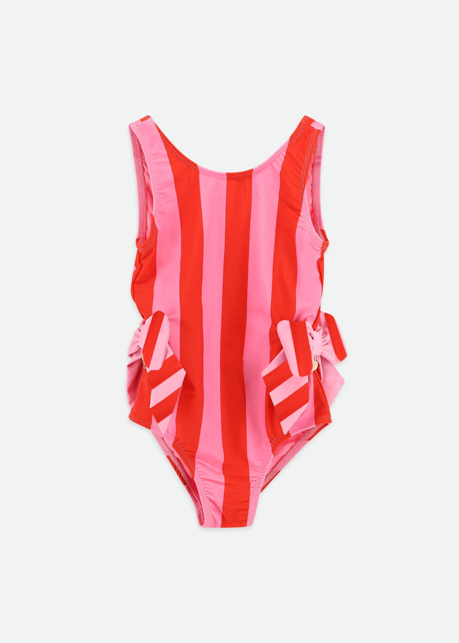Stylish striped swimsuit for girls in pink with bow detailing. The swimsuit features two gorgeous self fabric bows with our iconic gold heart charm on either side. The swimsuit is fully lined and made from SPF 50 fabric for optimum sun protection.