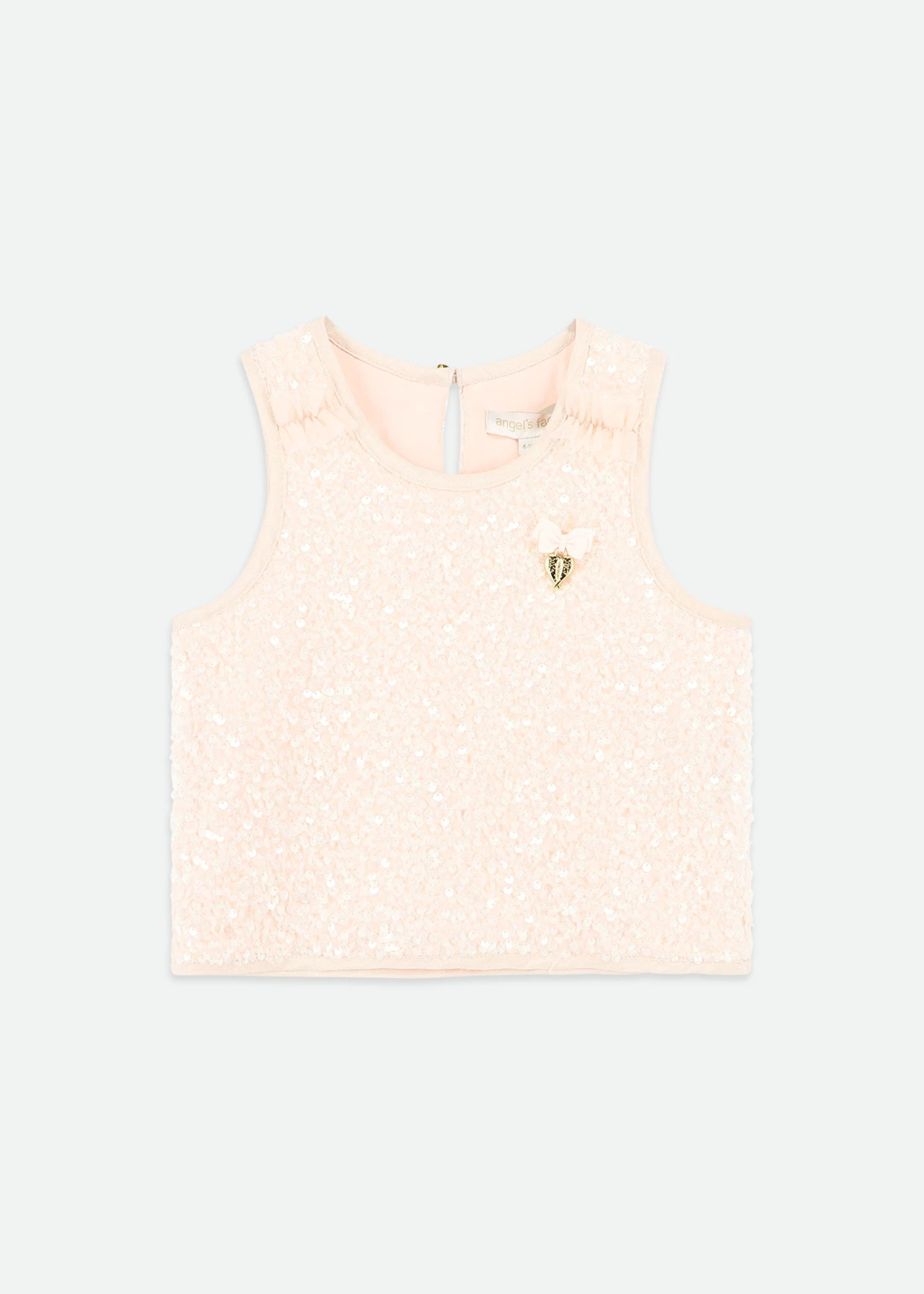 Girls peach vest top with a sparkling sequin shell. Round neck sleeveless top, fastens at the back with our signature Angels Face gold button. Features an Angel’s Face signature bow and gold heart charm on the chest. Fully lined for comfort.