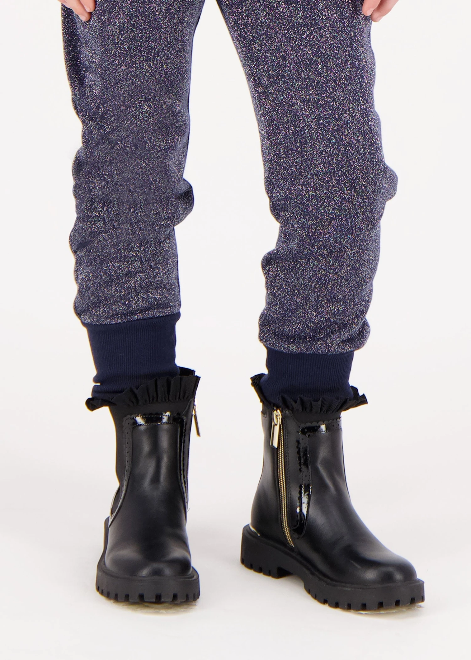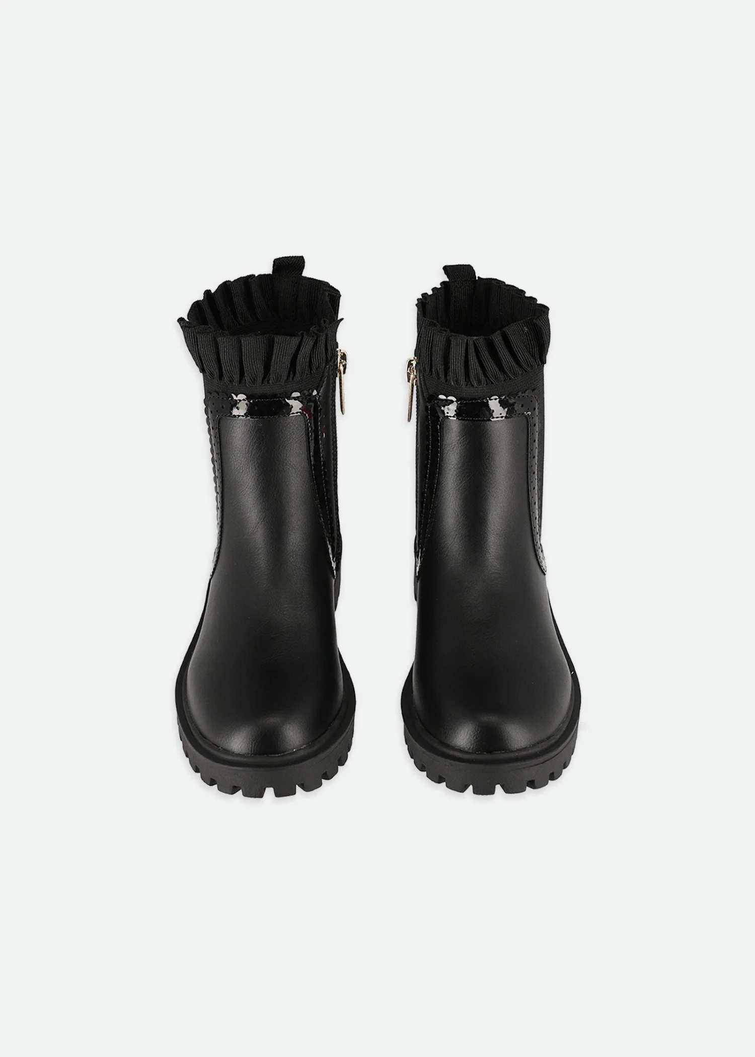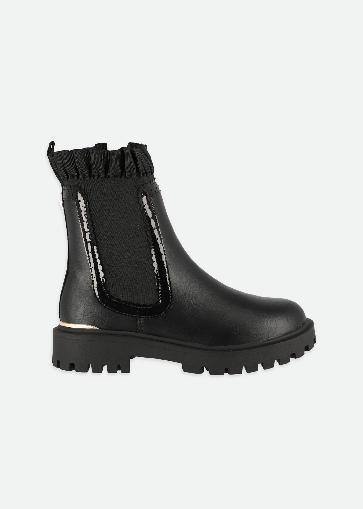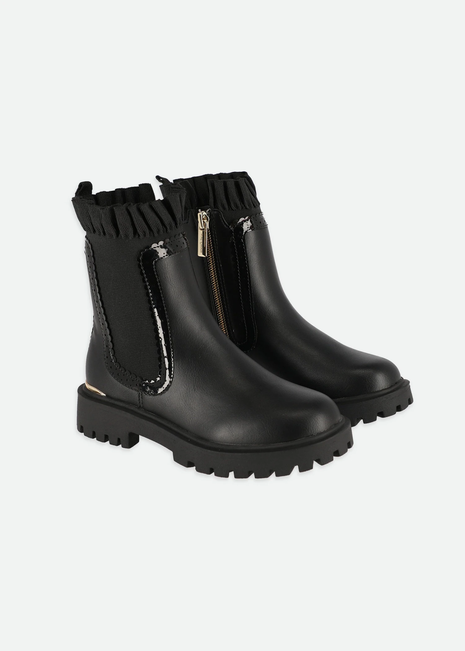 High-profile Chelsea boots with an elastic gore on one side, zips on the inside and loops at the top to make them easy to get on and off. Pretty ruffle detail around the top of the boot. Soft velour linings, insoles and chunky soles. Gold logo heart charm on the back.