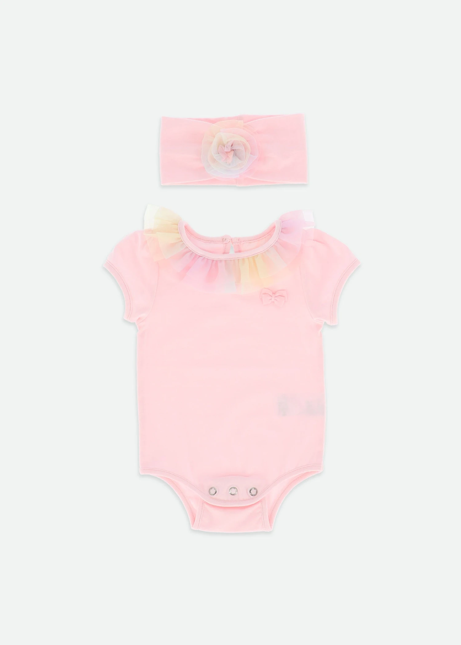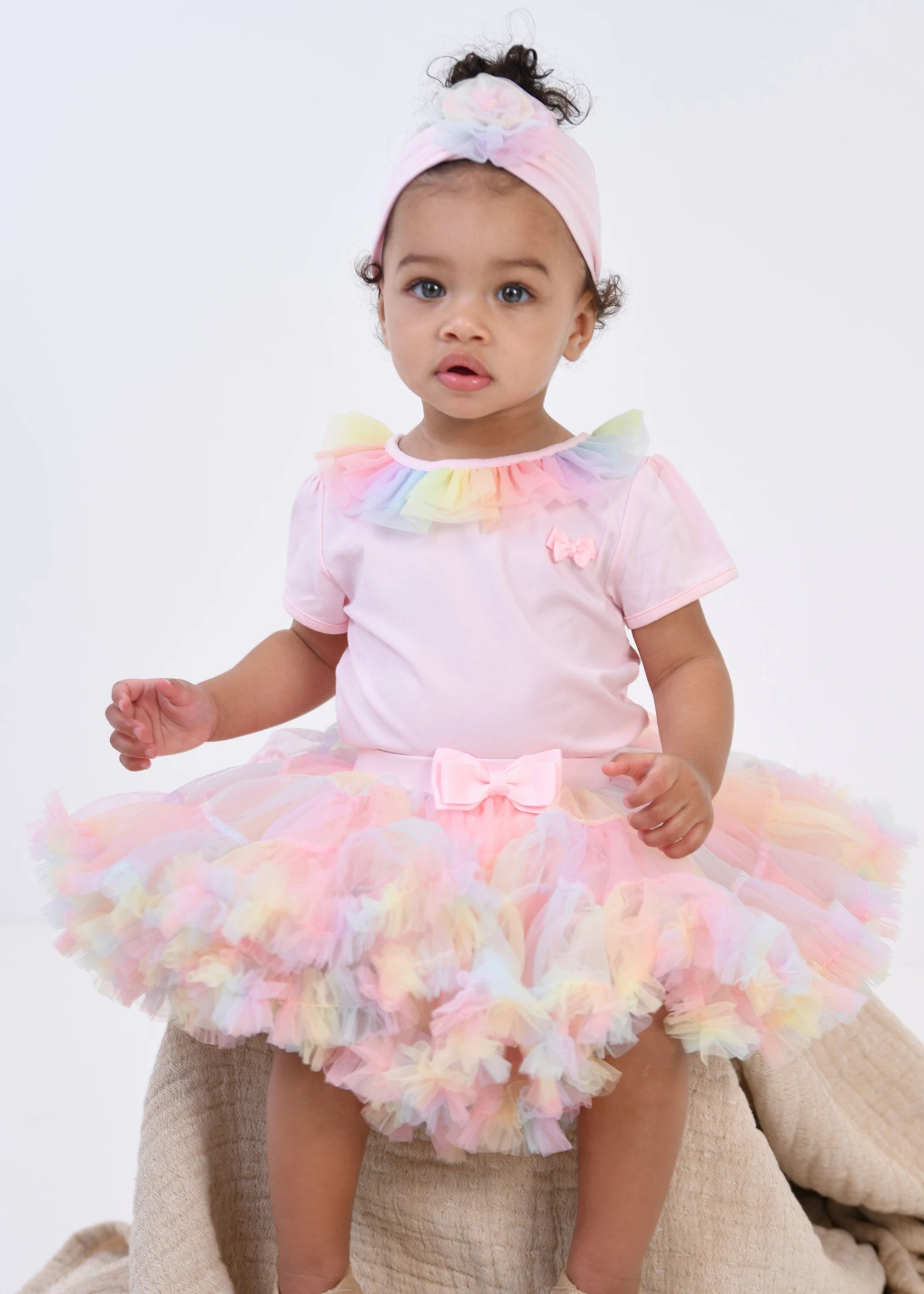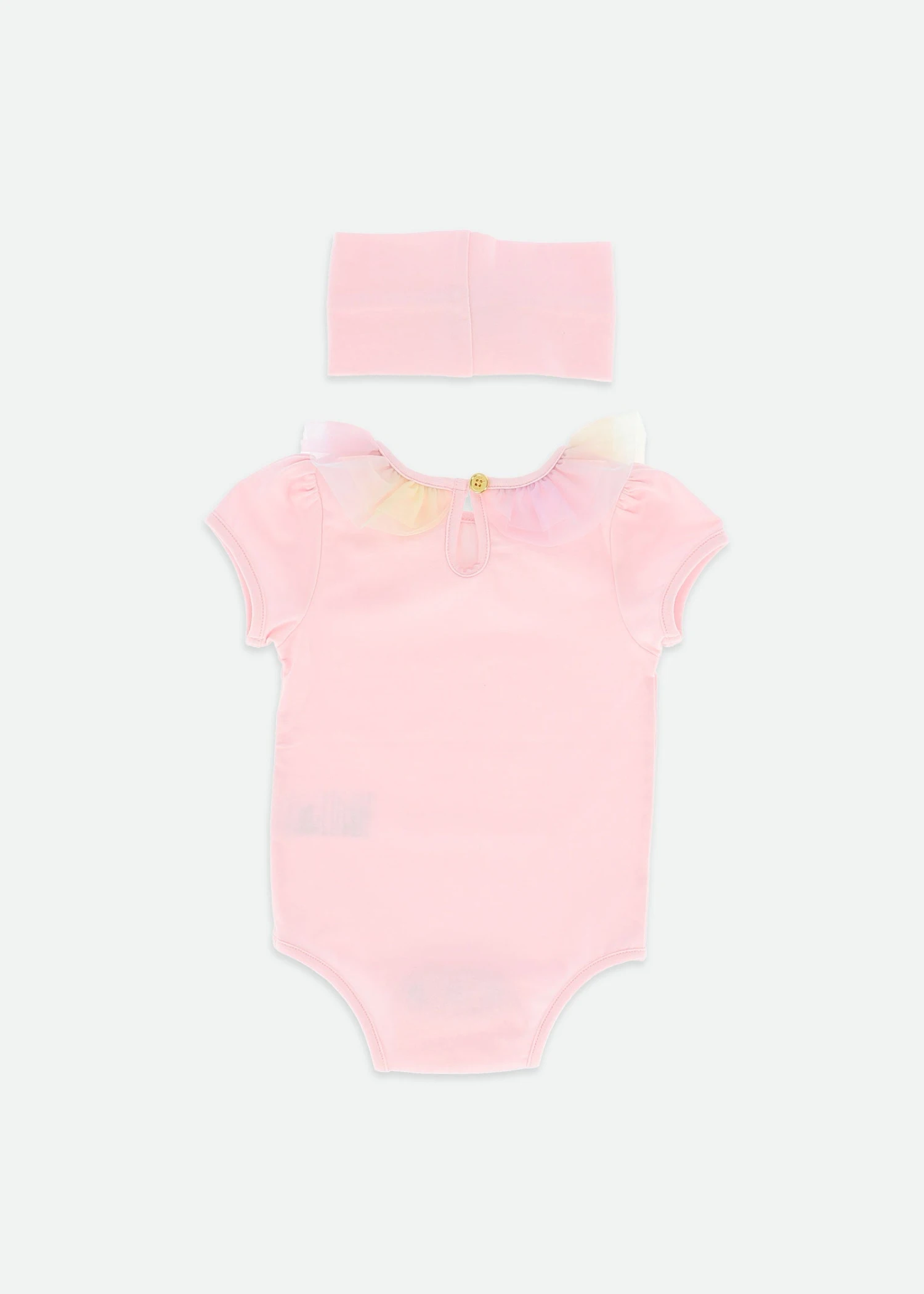 Adorable pale pink all in one for baby girls. The short-sleeved baby grow fastens at the crotch with gold poppers and back neck with a logo button. Detailed with a rainbow tulle ruffle collar and our signature bow on the chest. Babygrow comes with a headband to match.