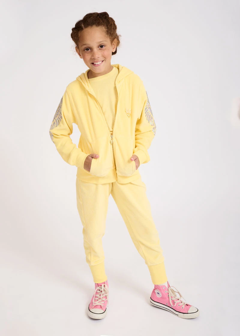 Super soft velour tracksuit bottoms in sunshine yellow. Joggers have soft stretch elasticated rib cuffs and waistband with a fixed decorative drawcord. Detailed with side pockets edged with our signature bow and gold heart charm to one side.