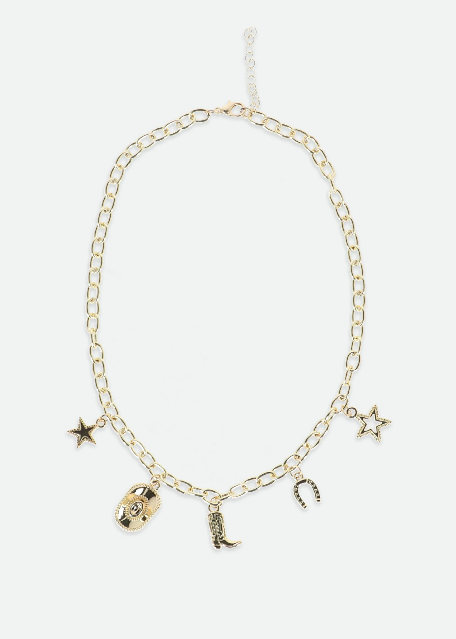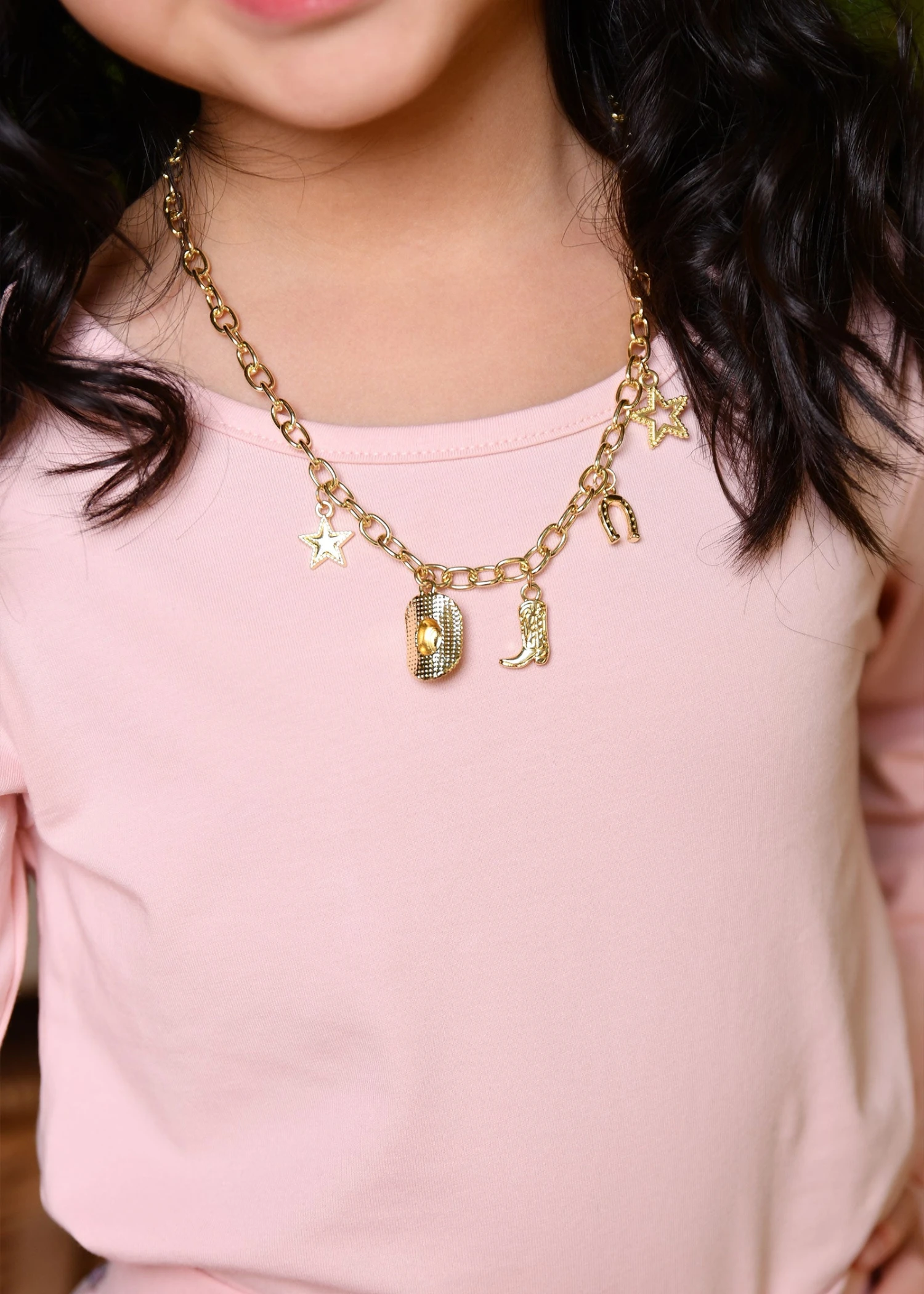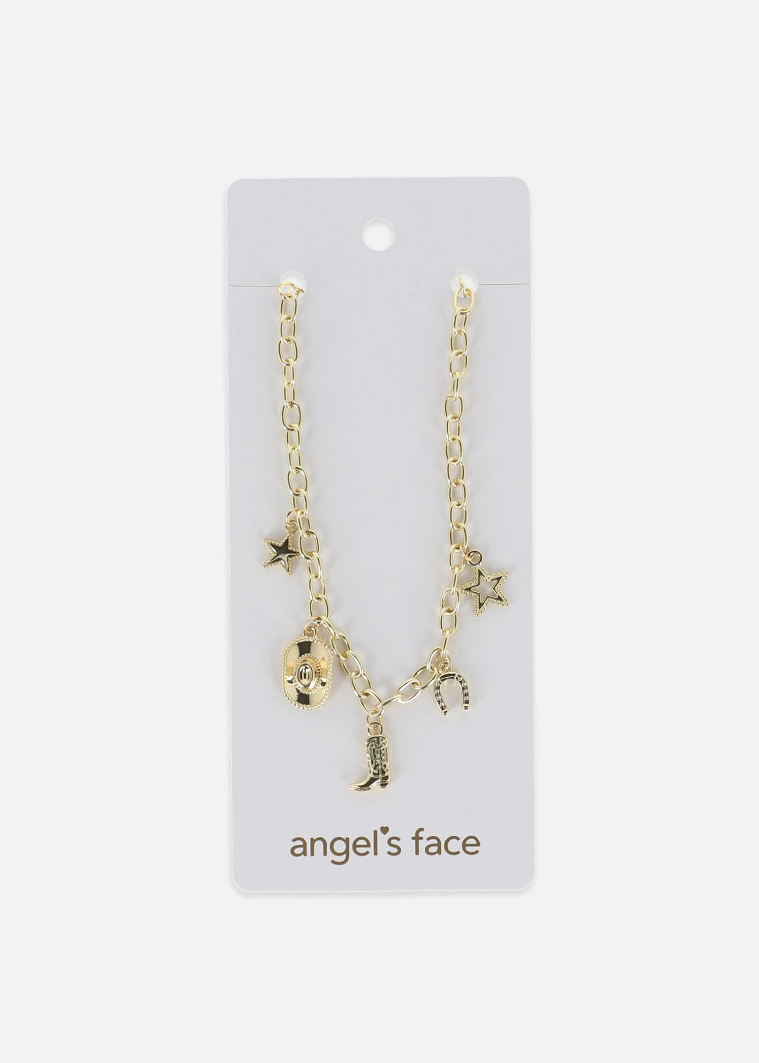 Girls western charm necklace with cute gold Angel’s Face charms. Fastening at the back with a simple lobster clasp, perfect for little fingers.