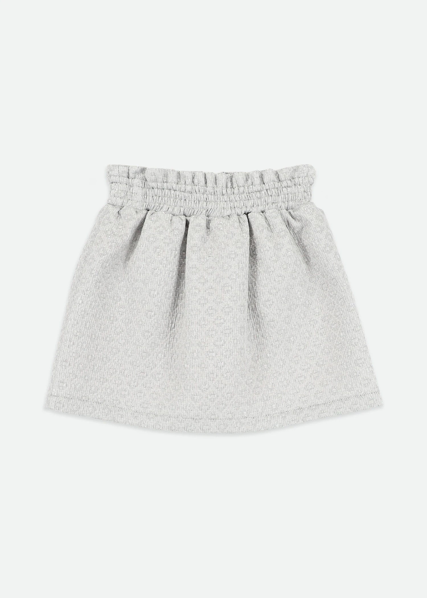 Classy silver jacquard skirt for girls. The skirt features an elastic ruched waistband with Criss-cross stitching and Angel’s Face signature bow and gold charm on the waistband. Featuring two front patch pockets, with frills on the front. The skirt is fully lined in a soft blend and falls on the knee.