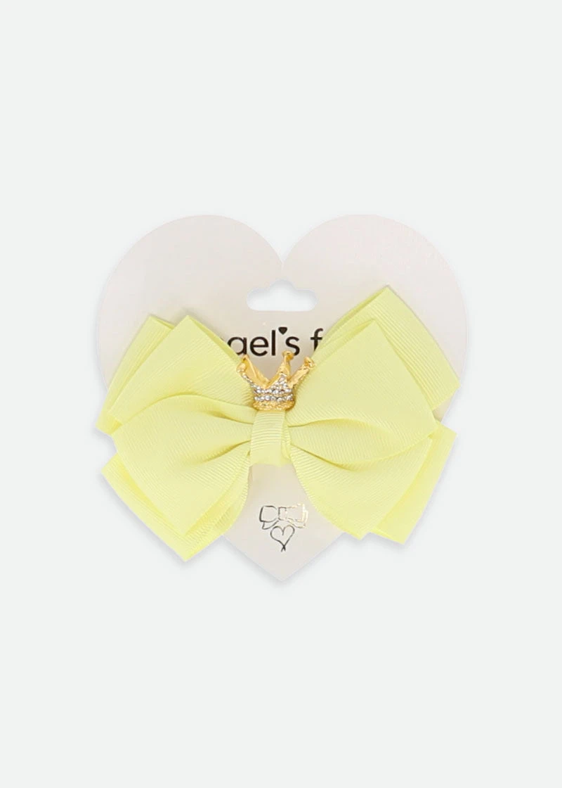 Our fabulous sparkle crown bow hair clip in a beautiful sherbet lemon, the perfect finishing touch to any outfit. The iconic bow features a sparkling gold crystal crown, fit for a princess.