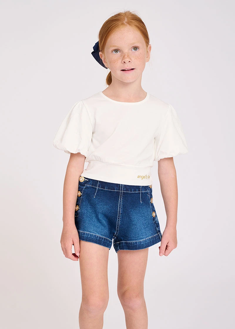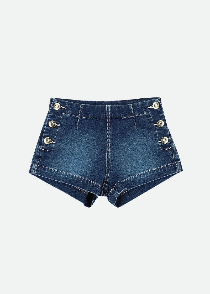 Stylish blue denim shorts for girls. Shorts feature crystal stud buttons on the front and internal waist adjusters for growing girls.