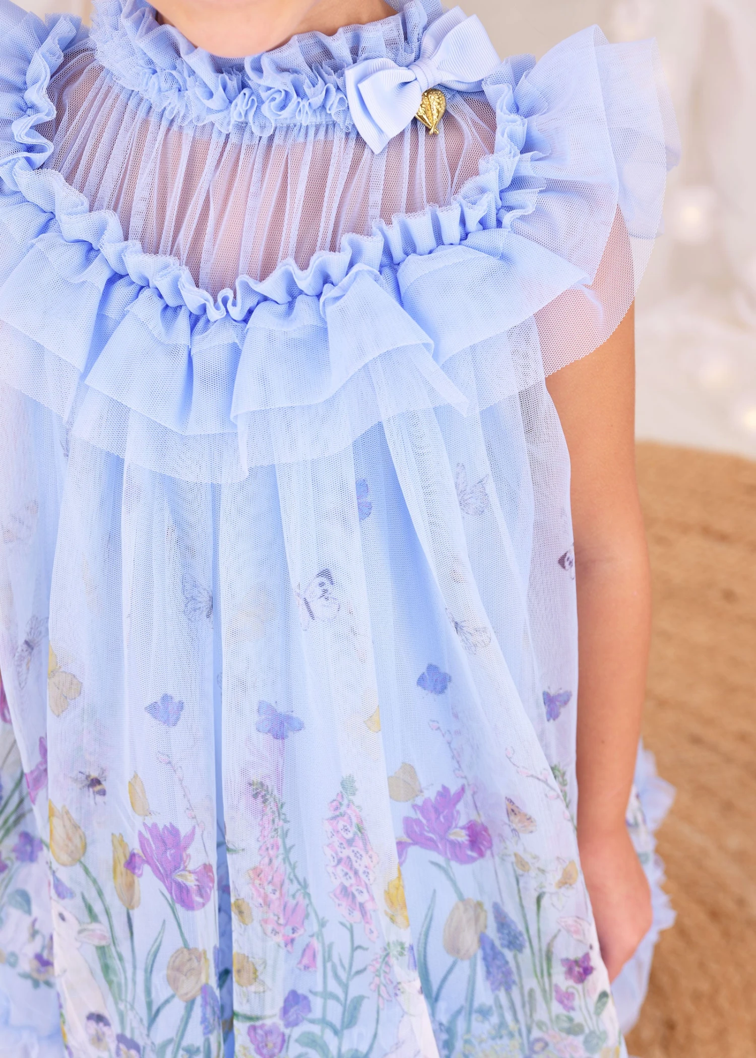 Voluminous dress for girls in pale blue. Made from our adorable new season bunny print with a beautifully soft lining for added comfort. The dress features a front yoke with tulle ruffle detail and a frilled neckline and our signature bow and gold heart charm. Fastening at the back with a gold logo button.
