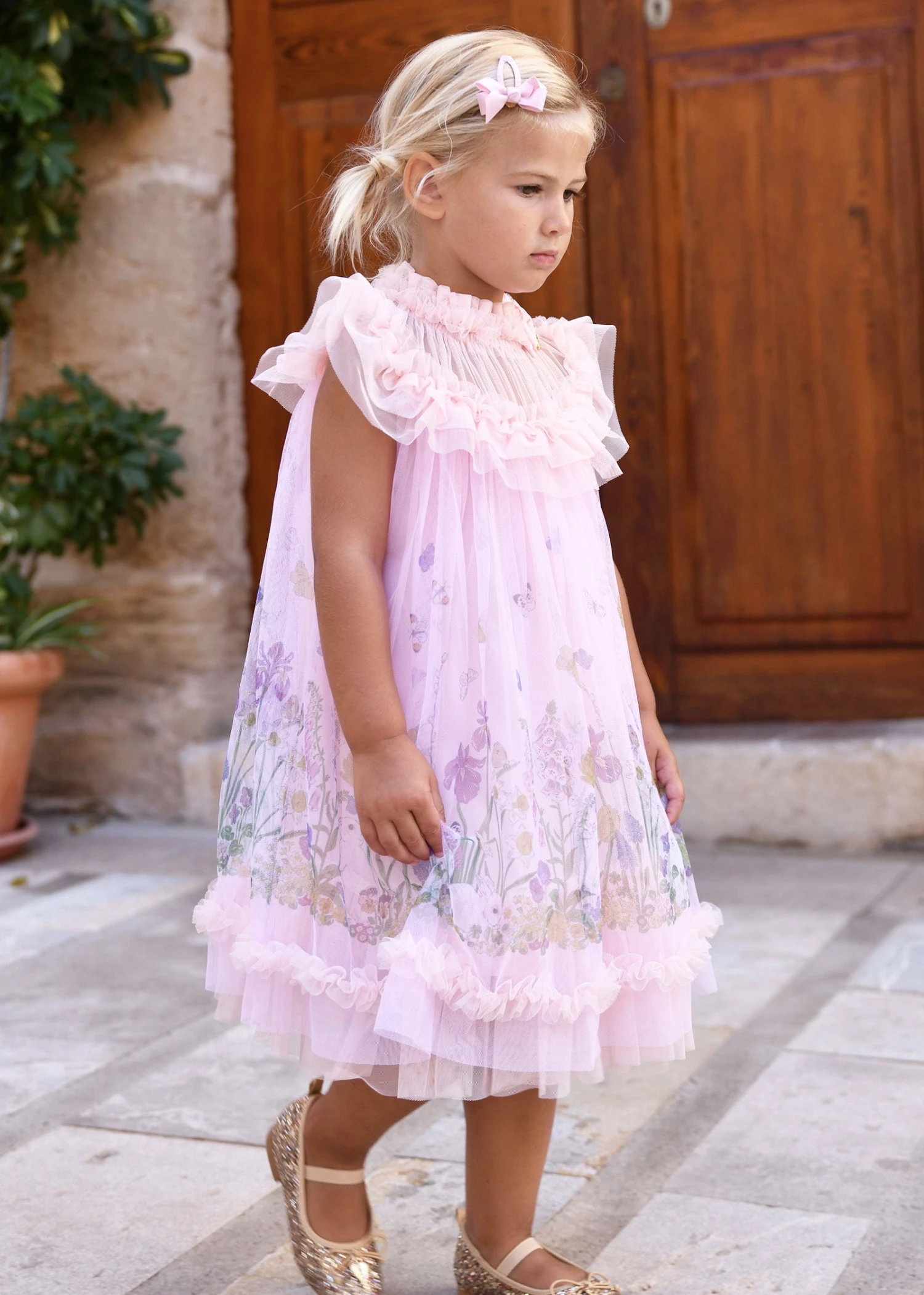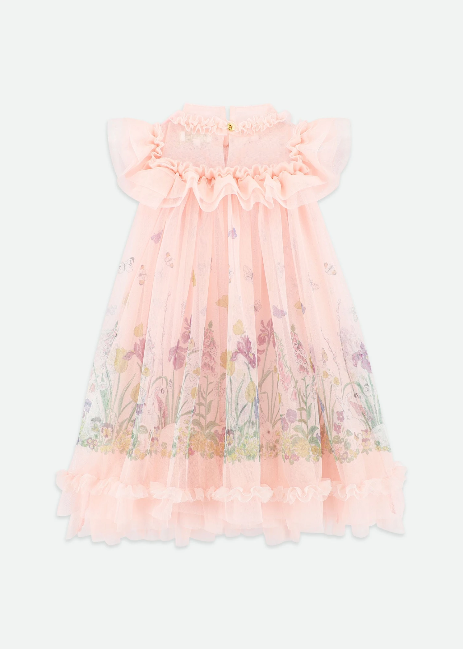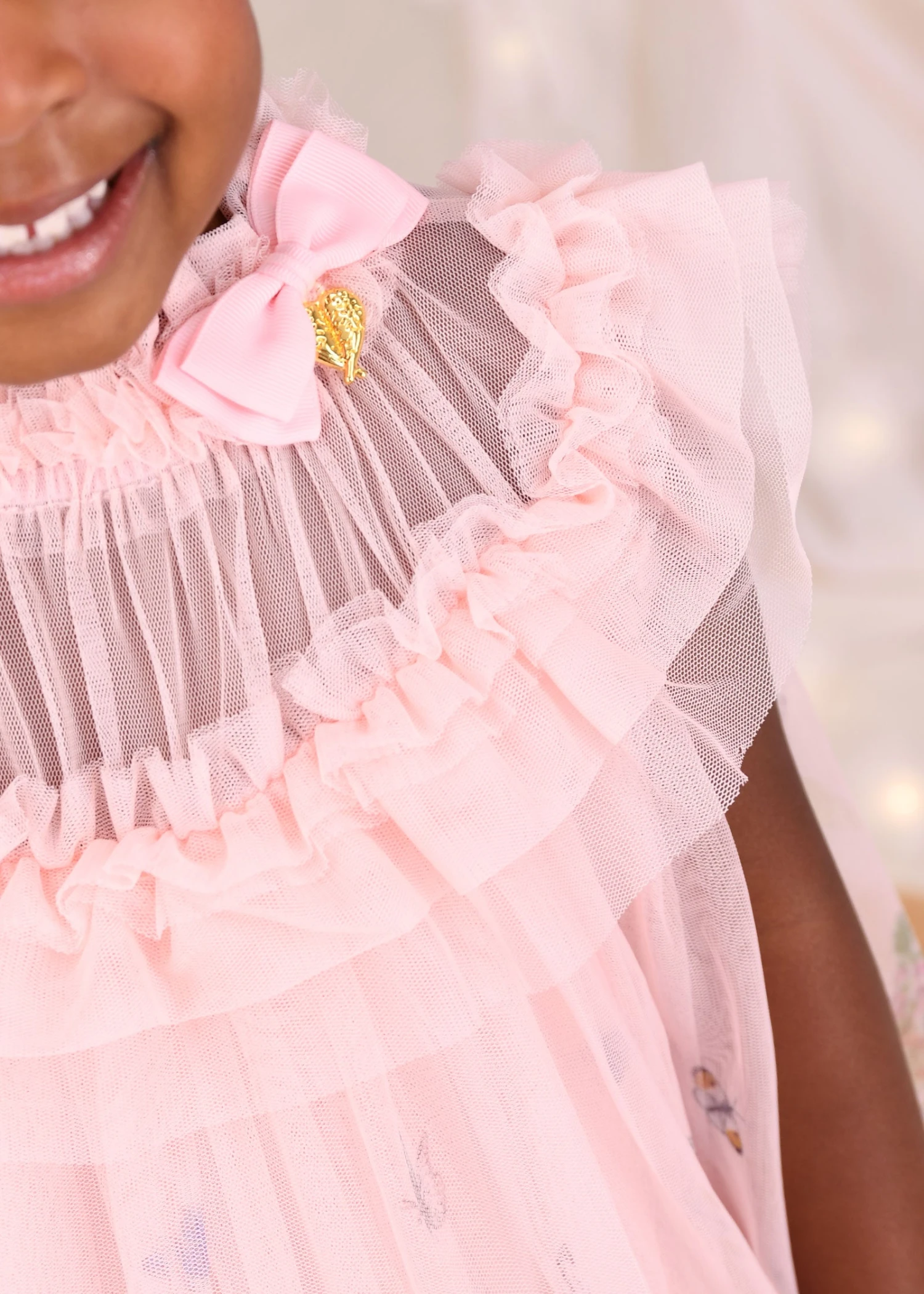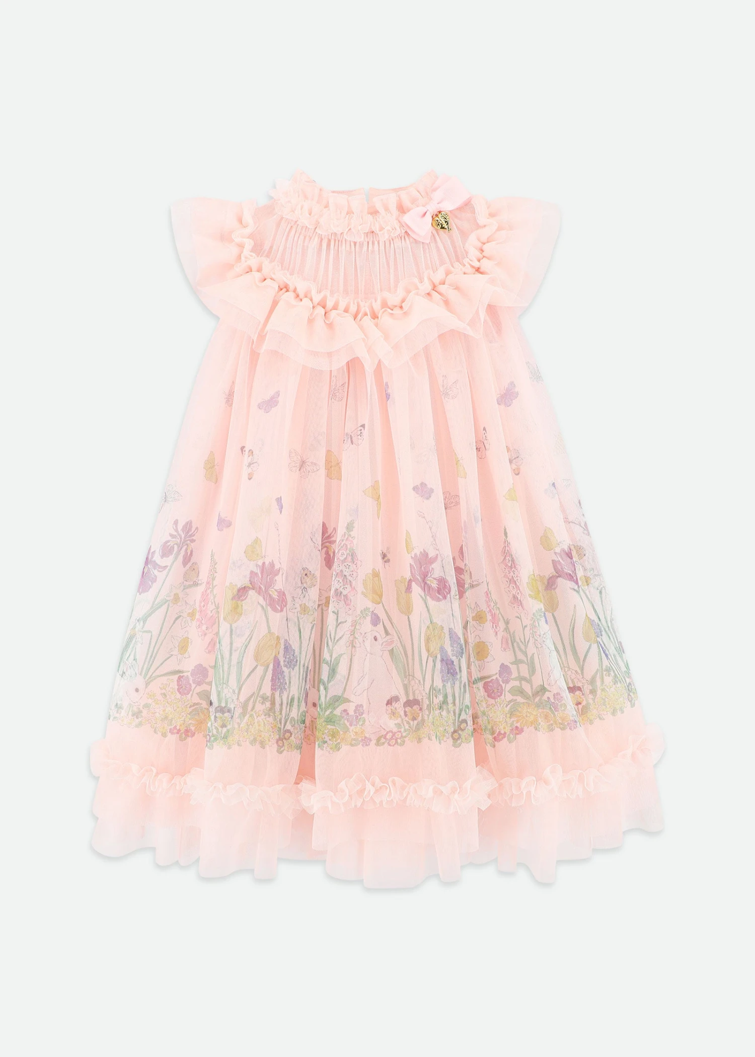 Voluminous dress for girls in pale pink. Made from our adorable new season bunny print with a beautifully soft lining for added comfort. The dress features a front yoke with tulle ruffle detail and a frilled neckline and our signature bow and gold heart charm. Fastening at the back with a gold logo button.