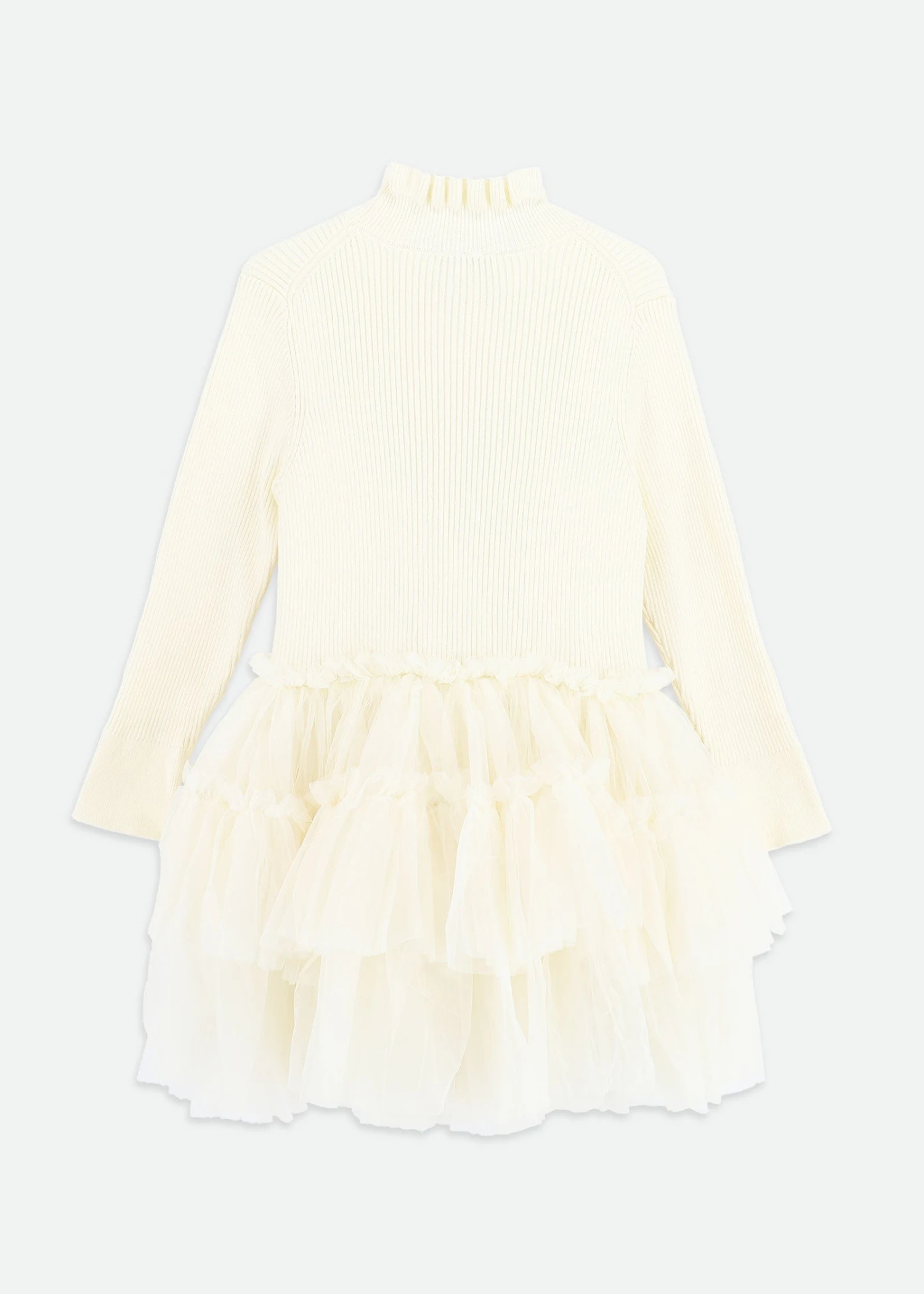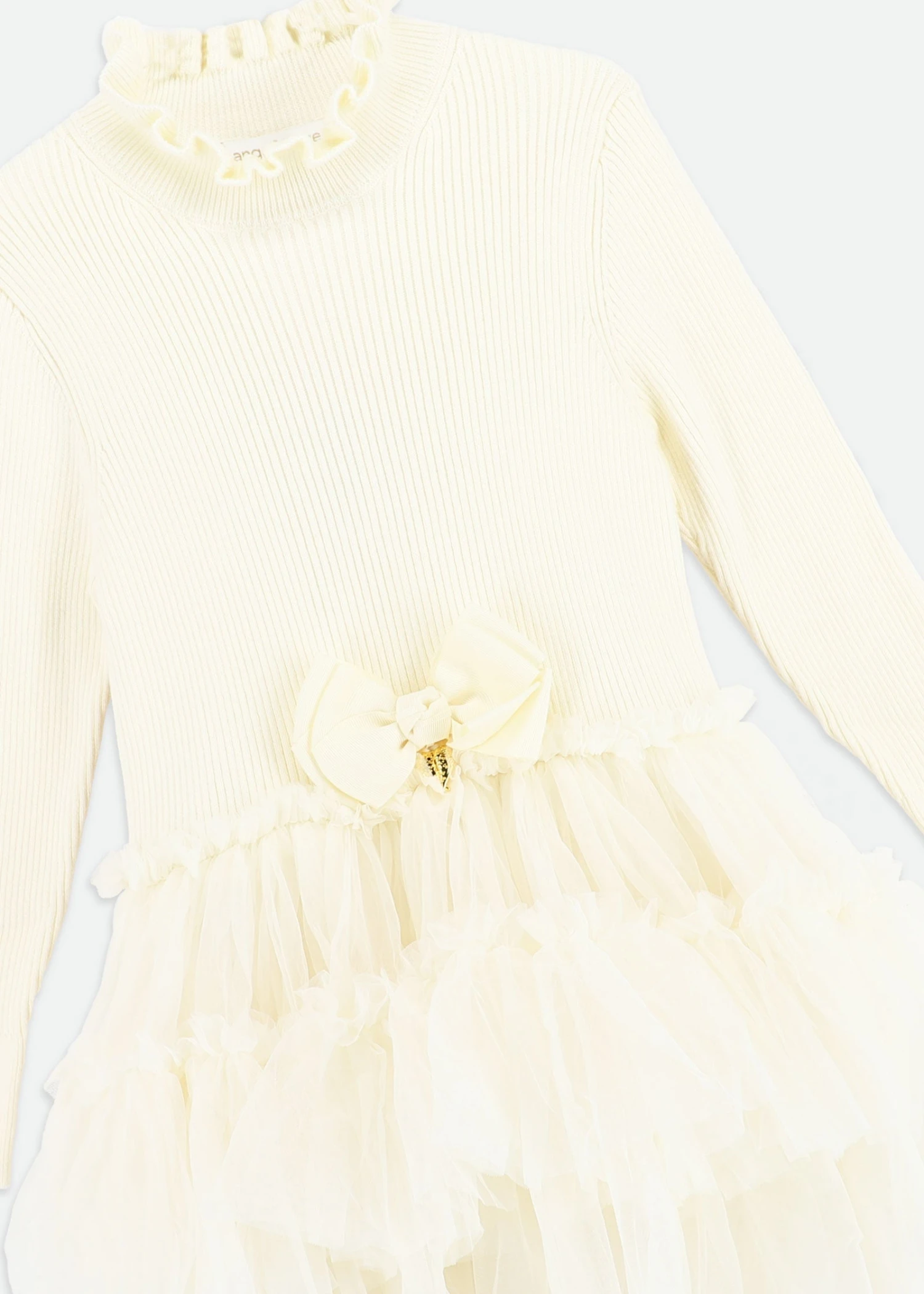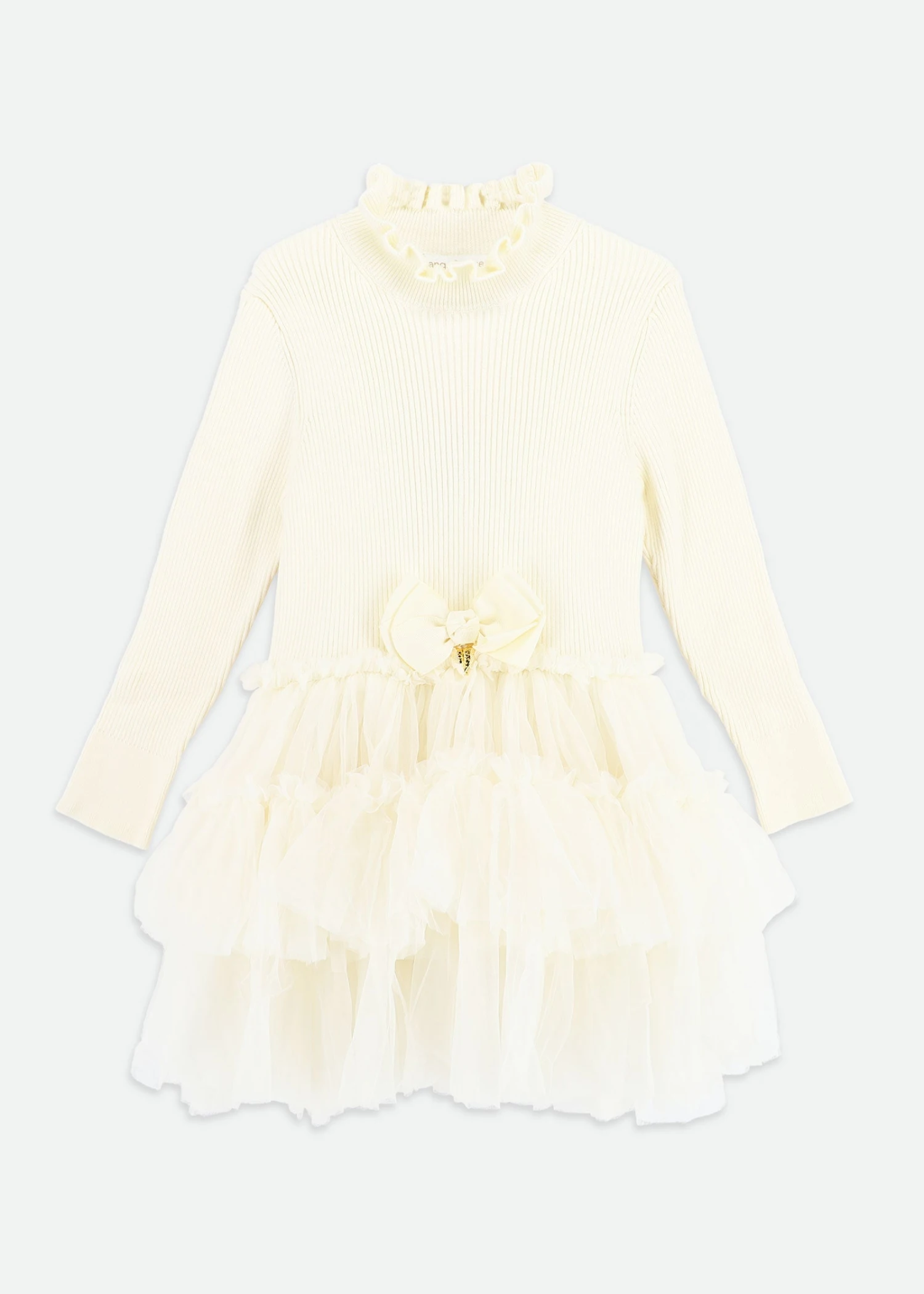 Elegant ribbed jumper dress with tulle layered skirt in Vanilla. This dress features layers and layers of soft tulle with a cotton lining. Finished with a frilled neck and our signature bow and charm on the waist.