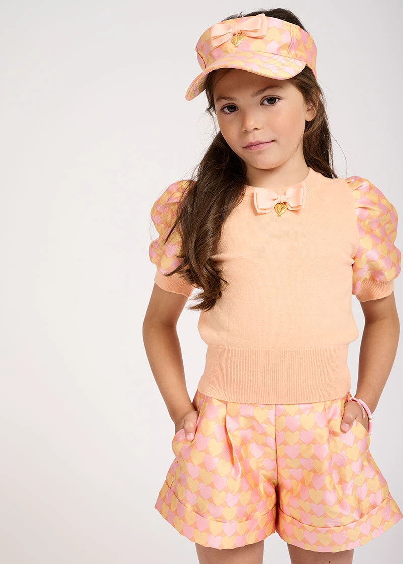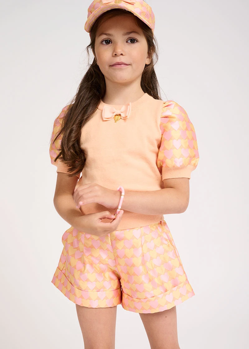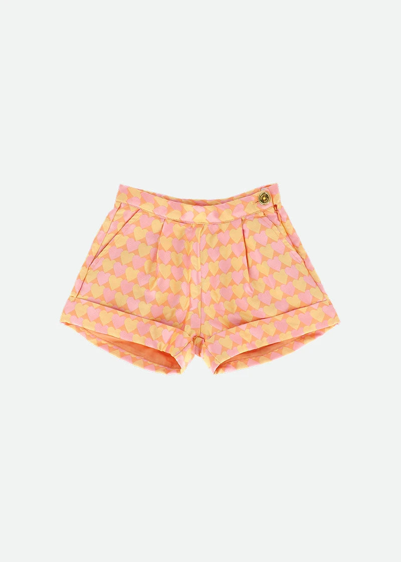 Orange and yellow special occasion shorts in an exquisite heart jacquard design. Detailed with a turn up hem, side pockets and fully liked in a silky orange polyester. Shorts fasten at the side with a invisible zip secured with a large logo button.