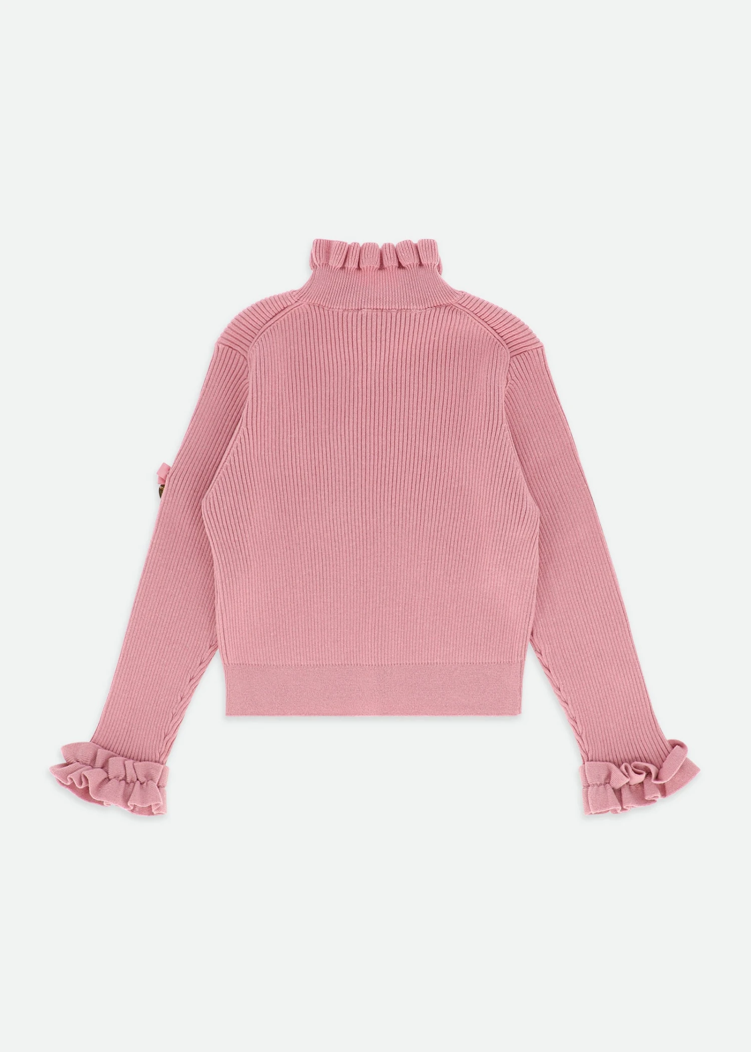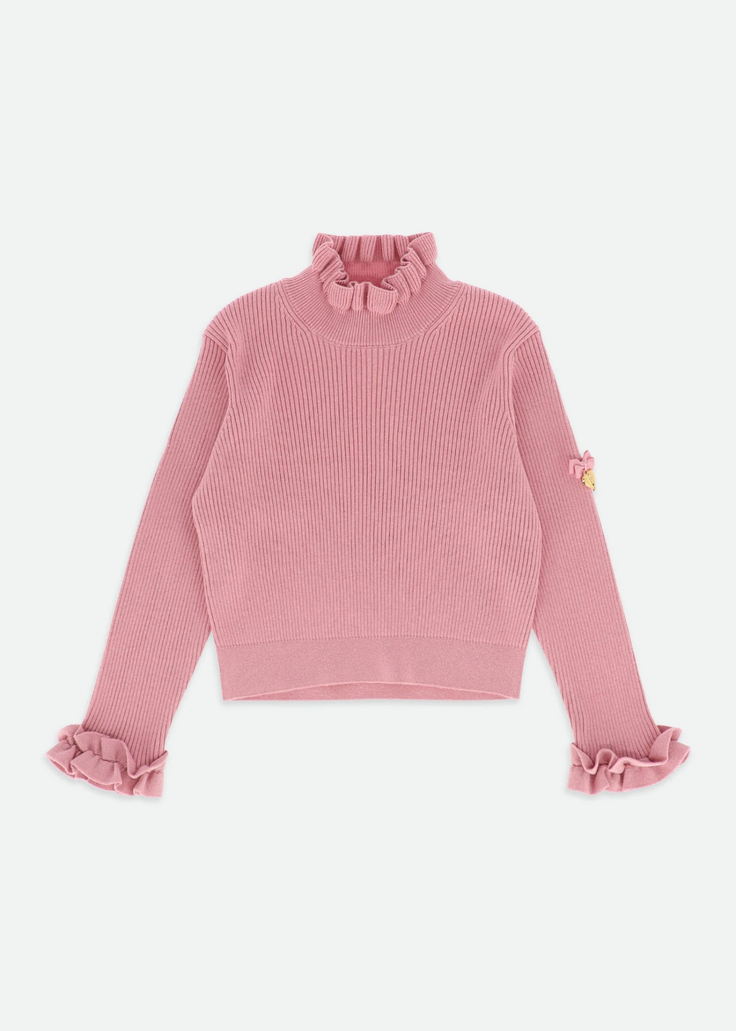 Pretty Ribbed Tea Rose Jumper with ruffle detailing. Designed in the softest cotton knit, this jumper is finished with a frill at the neck and cuff. Features our signature bow and gold heart charm on the sleeve.