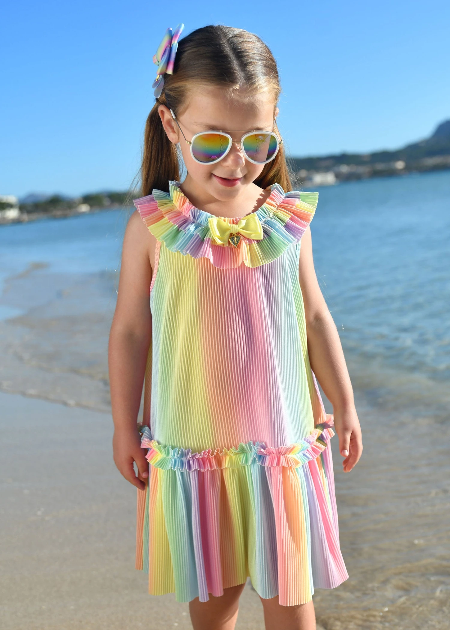 Super soft dress in rainbow with fortuny pleats. This dress features an elegant ruffled neckline and an easy-to-wear A-line shape. Detailed with Angel’s Face signature bow and gold heart charm on the neckline. The dress fastens at the back with gold logo button.