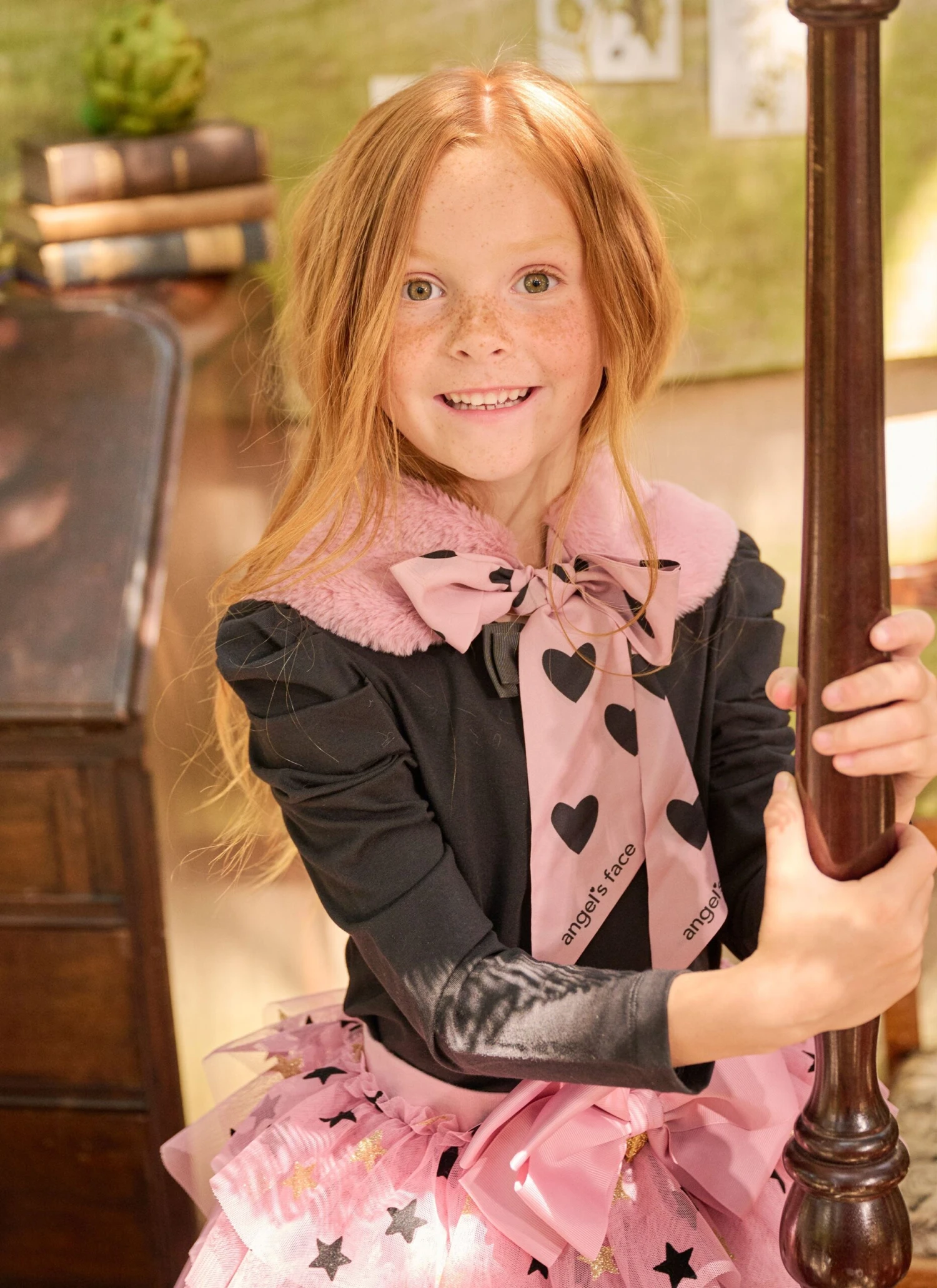 Our faux fur collar is the ultimate winter accessory this season! The cute peter pan collar shape in our luxurious fur is secure with a gorgeous chiffon bow featuring adorable hearts and the Angels Face logo.