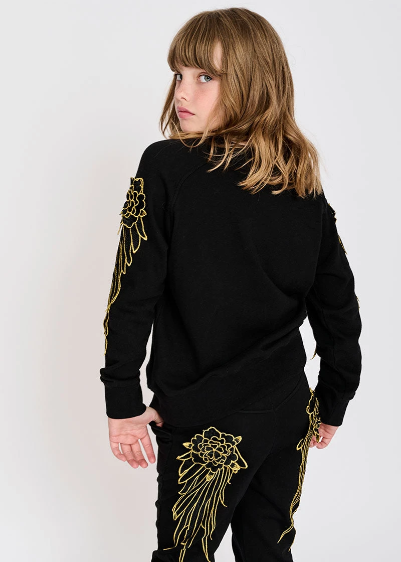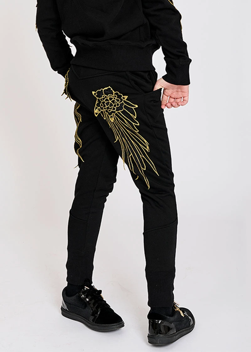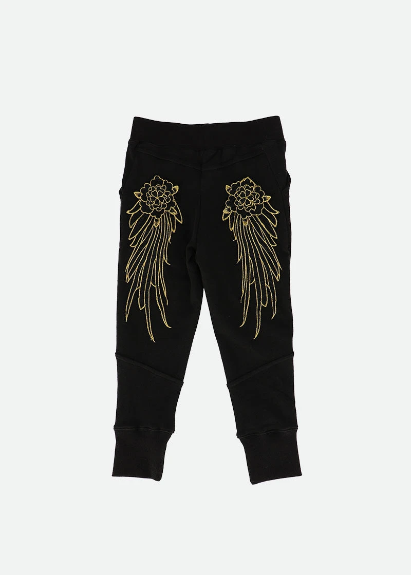 Made from traditional lightweight cotton jersey sweatshirt fabric, our Emma joggers are made to be worn as a set with the coordinating Emelia tracksuit top. The fit is slim which gives them a smarter look and on the leg are beautiful, gold embroidered wings that hang delicately on the side.