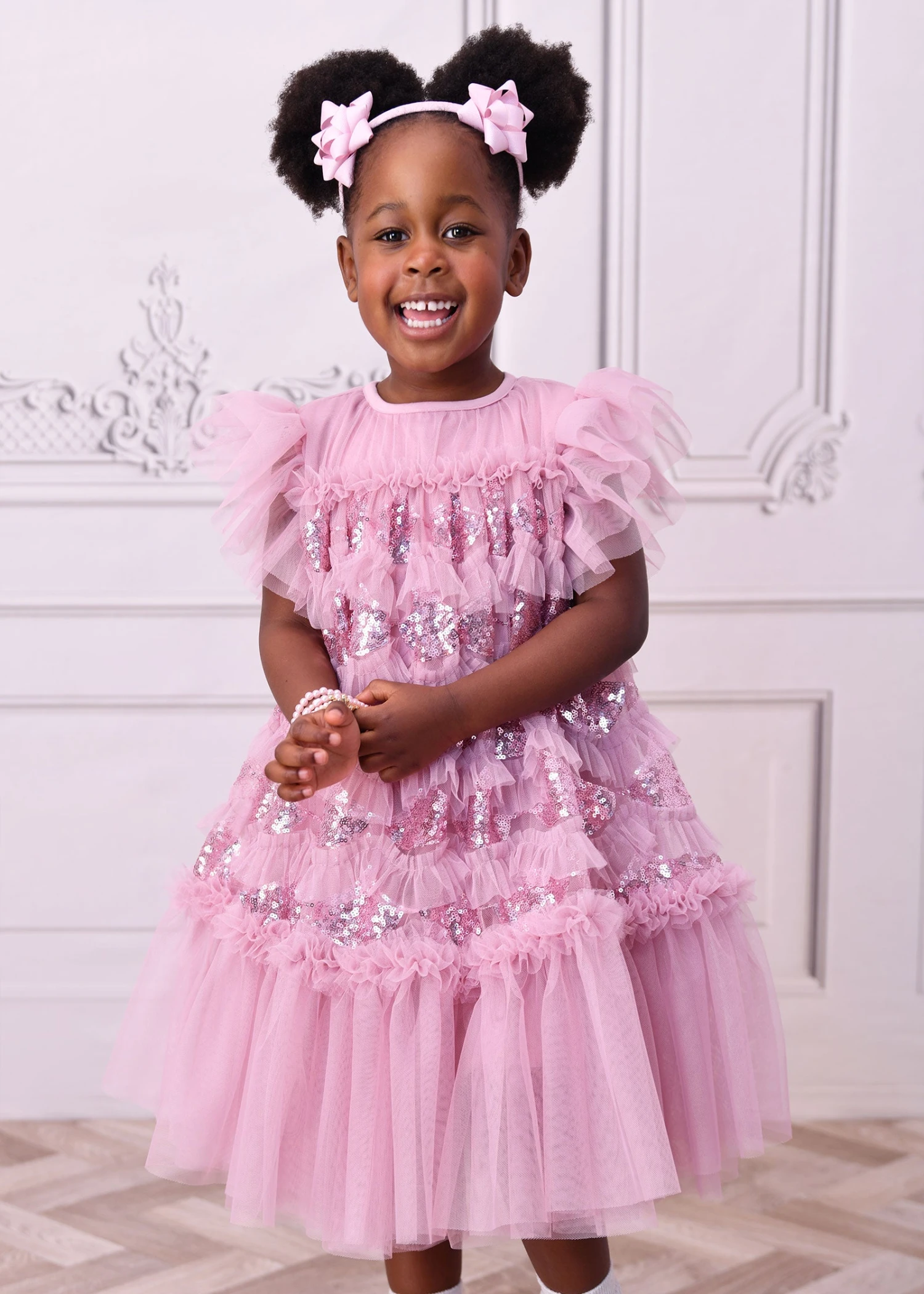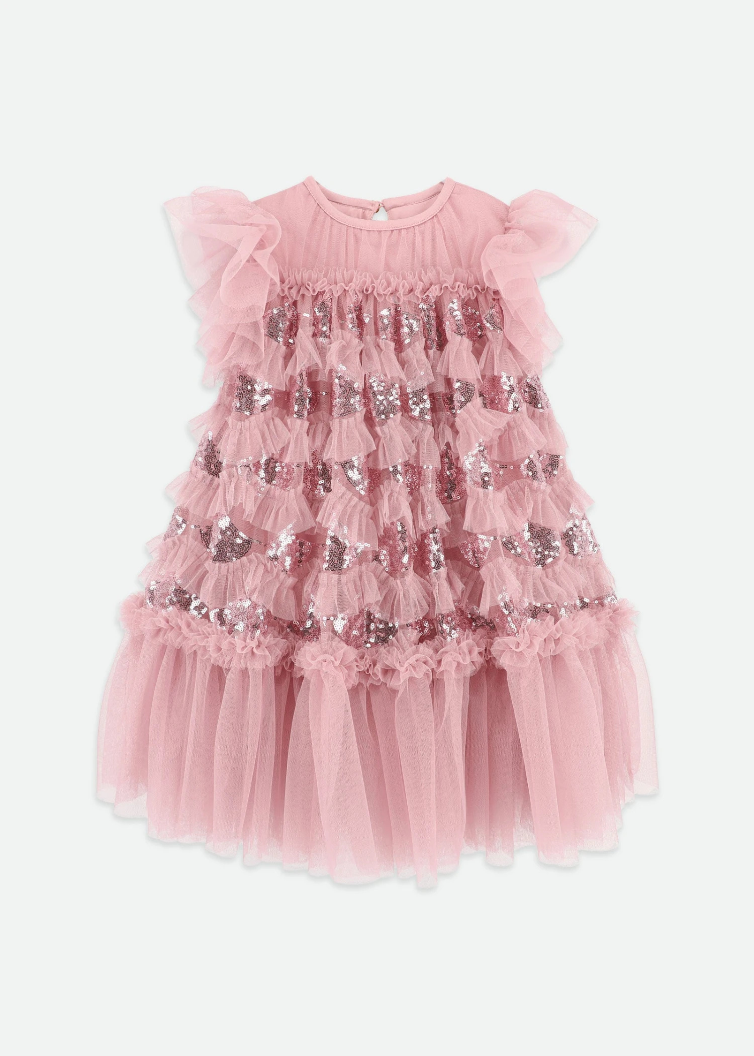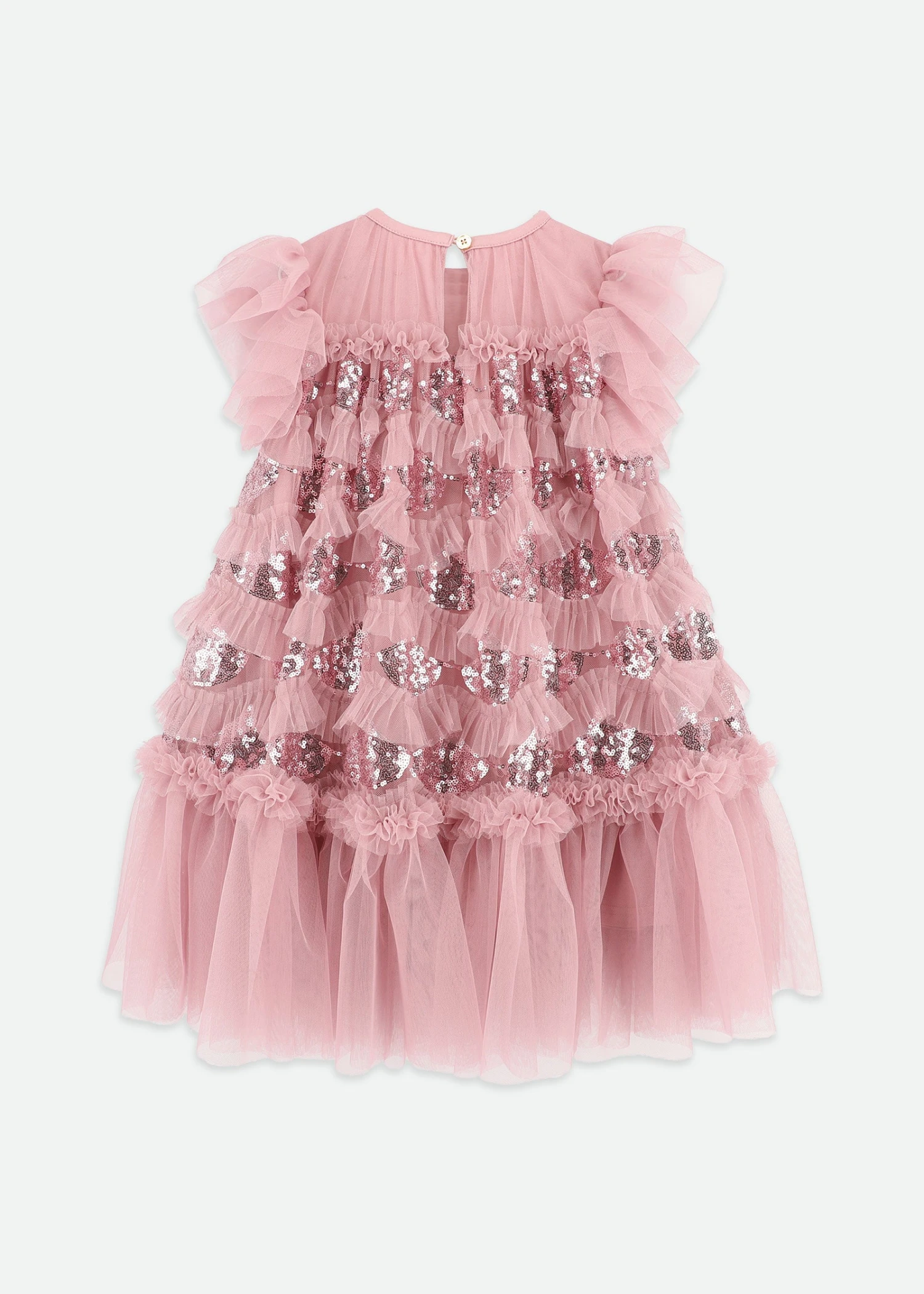 Make every day feel like a party in this beautiful blush pink tulle dress for girls. The layered design is covered in rows of shimmering sequins and soft frills for a magical, sparkly look. Pretty ruffle sleeves and a flouncy hem add extra volume and movement, perfect for twirling. A delicate button fastening at the back completes this dreamy piece.