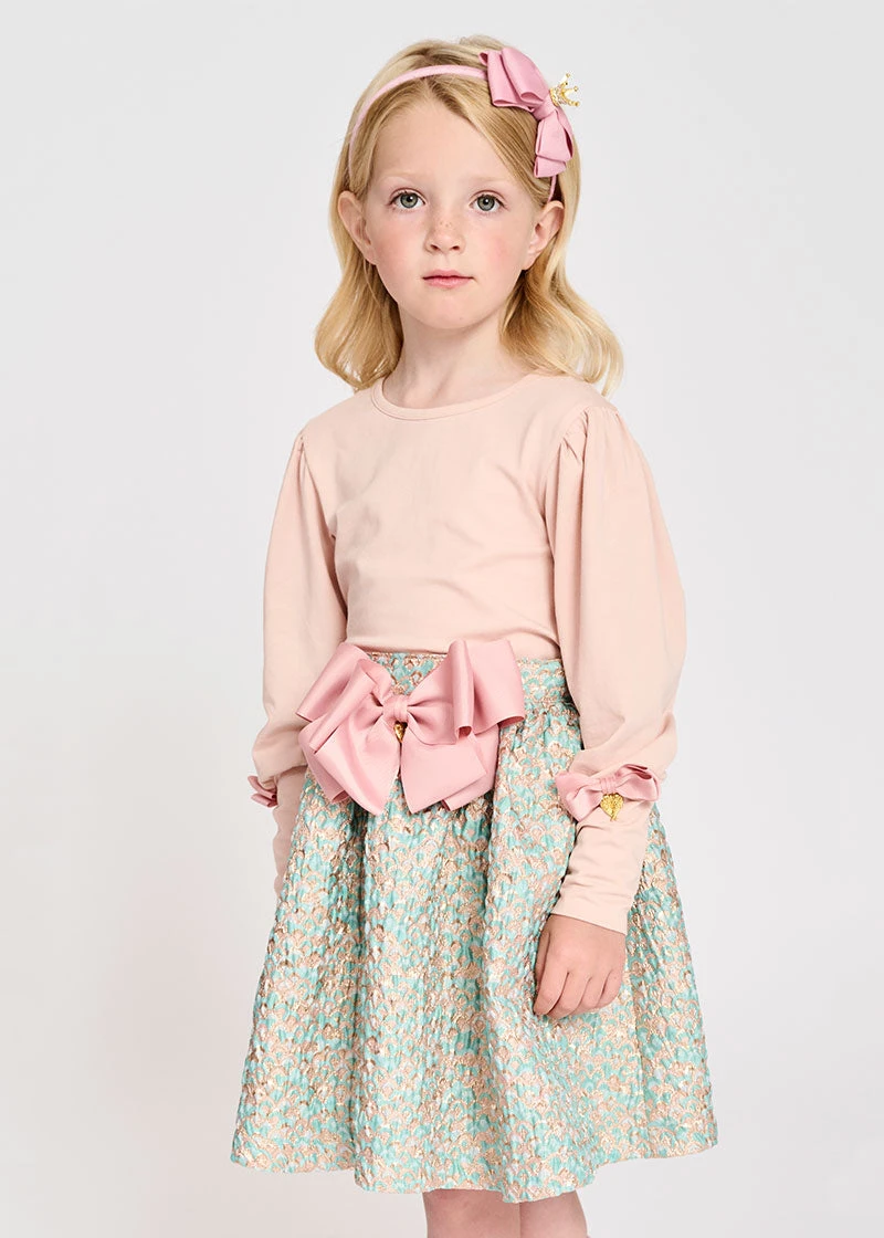 Evangeline is this season must have for your little girl, made in a soft cotton with an element of stretch for a super comfortable fit. The fabulous gathered puffed sleeves and deep cuffs give this piece elegance and style accompanied by a curved hem. Our signature bow and gold heart charm adorn the cuffs adding an Angel’s Face touch.
