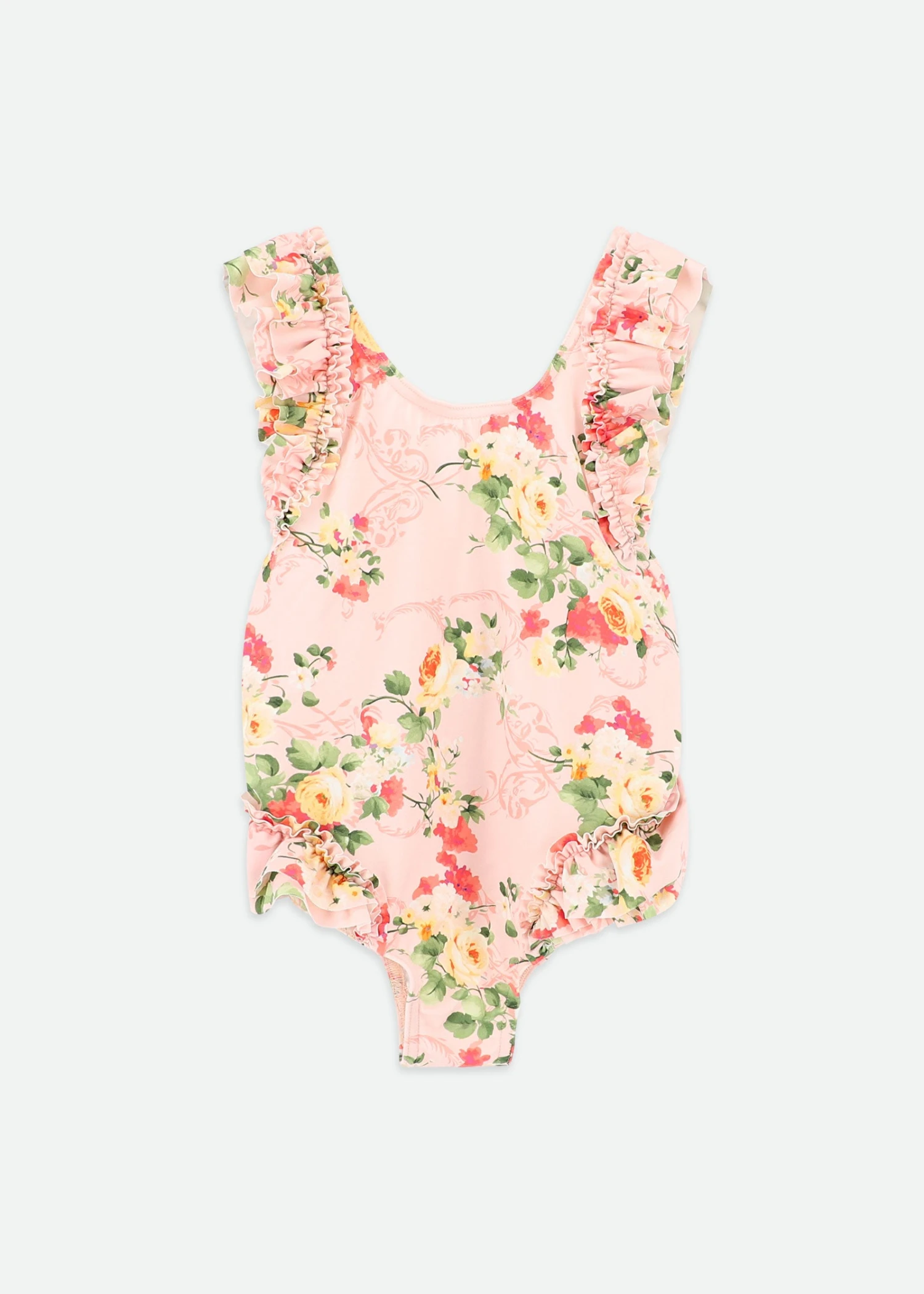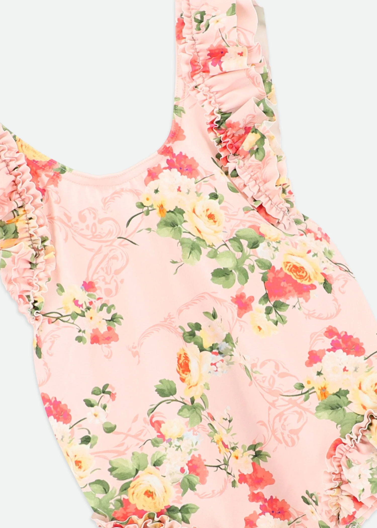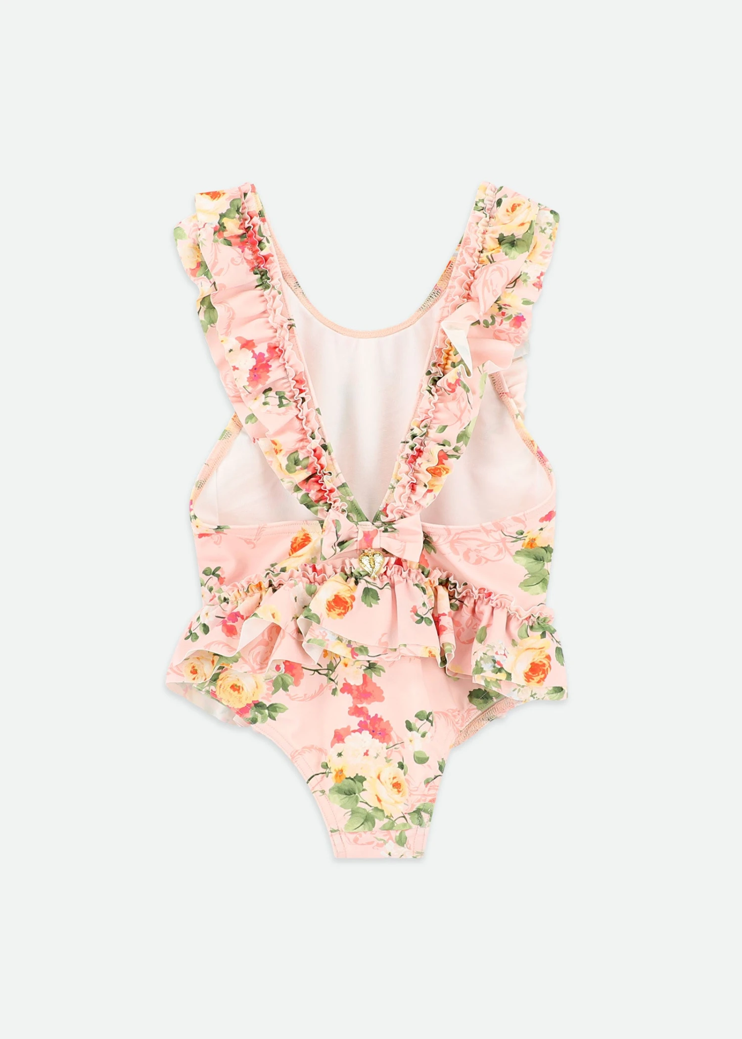 Fabulous summer swimsuit for girls in our pink primrose print. Details include pretty ruffle edging over the straps and around the waist. Complete with a bow and signature gold heart charm on the back. Swimwear is fully lined and made from SPF 50 fabric for optimum sun protection.