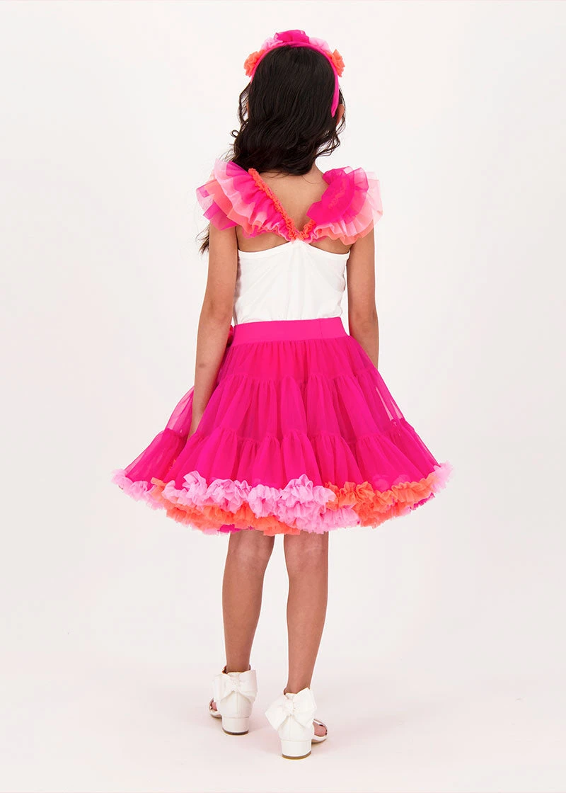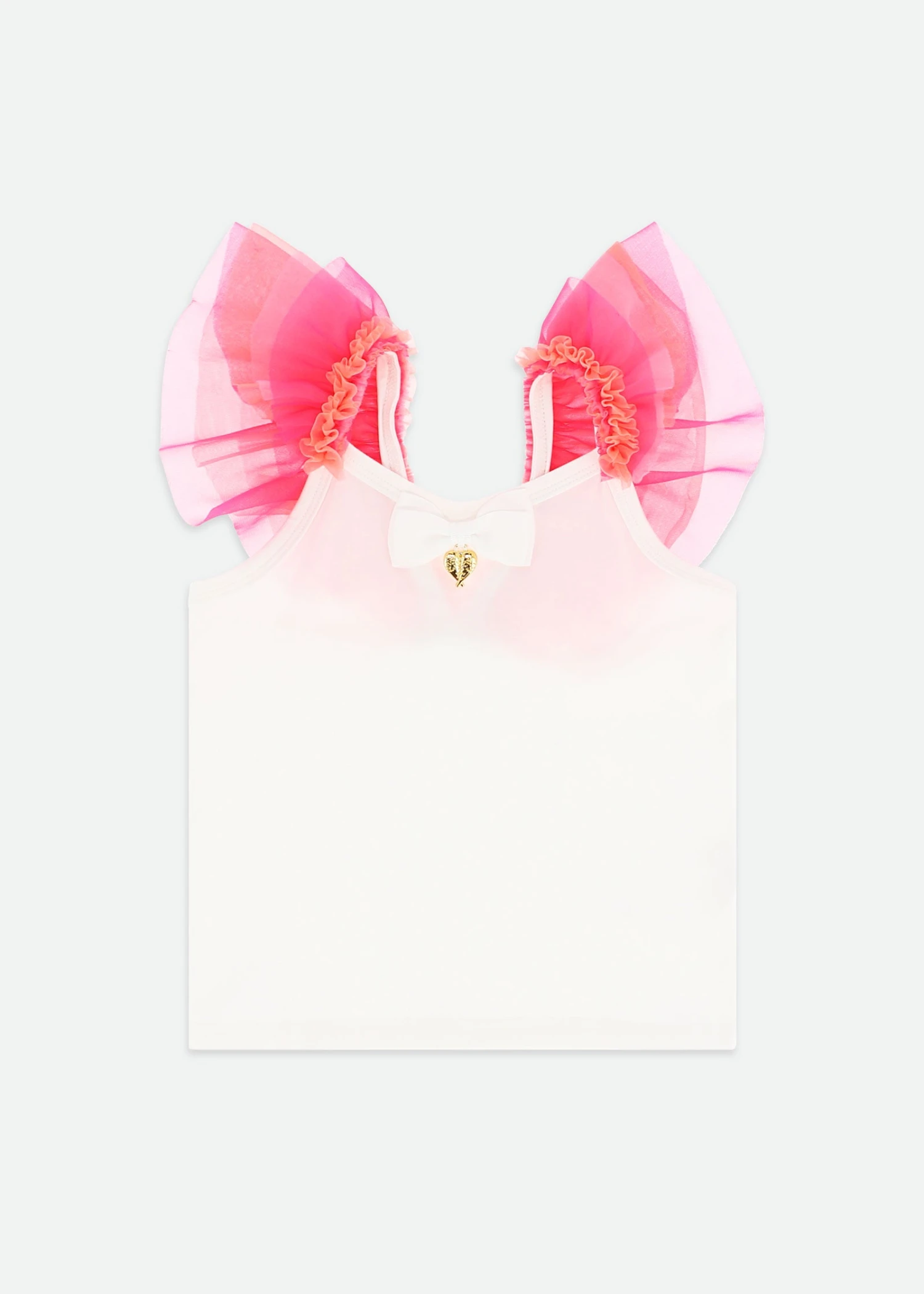 A pretty little vest top with a twist- our snowdrop flossy top has the most elegant tulle ruffles on the straps. Made from soft stretch cotton jersey to keep its shape, on the front is our signature bow and gold heart charm.