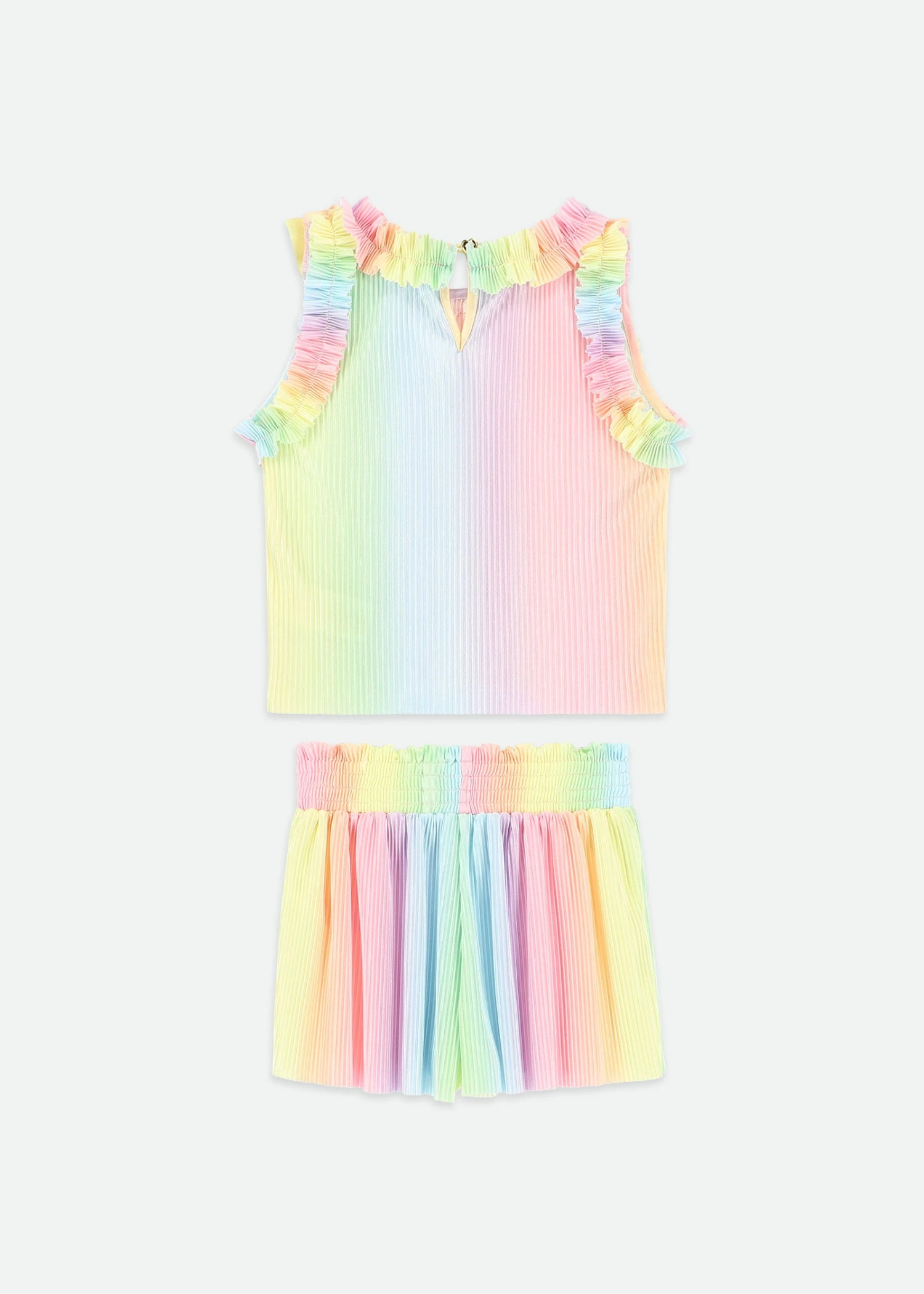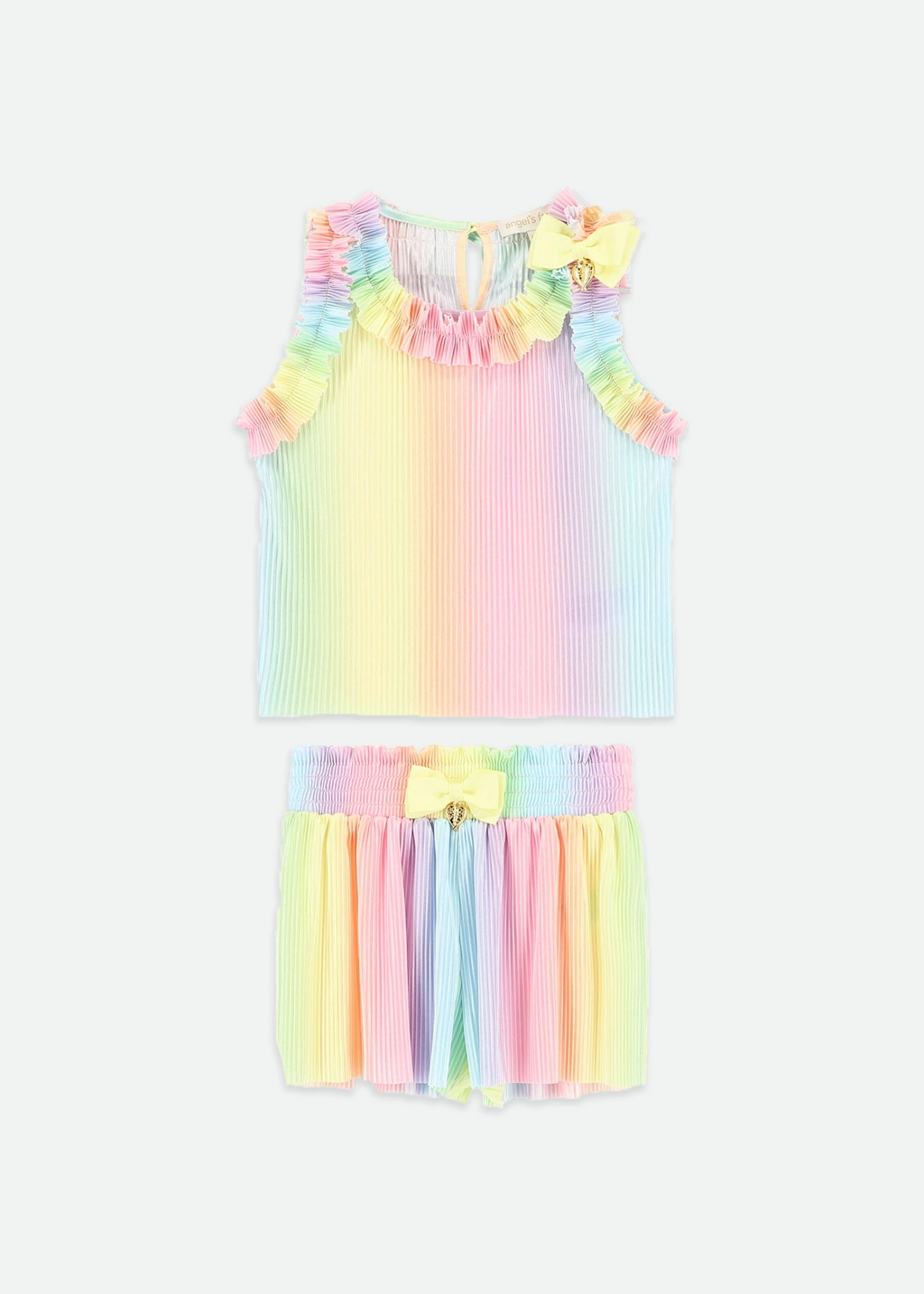 Finished with fortuny pleats throughout, this light and flowy set can be dressed up and down for any occasion. The shorts are easy to pull on with a stretchy waist and the top fastens at the back with a gold logo buttons. Featuring an Angel’s Face signature bow and gold heart charm on the neckline and waistband.