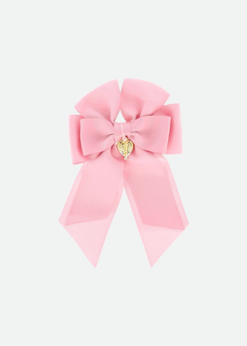 Stylish barrette bow hair clip for girls in pink. Bow is made from a soft polyester grosgrain, complete with our signature Angel’s Face heart charm in the centre.