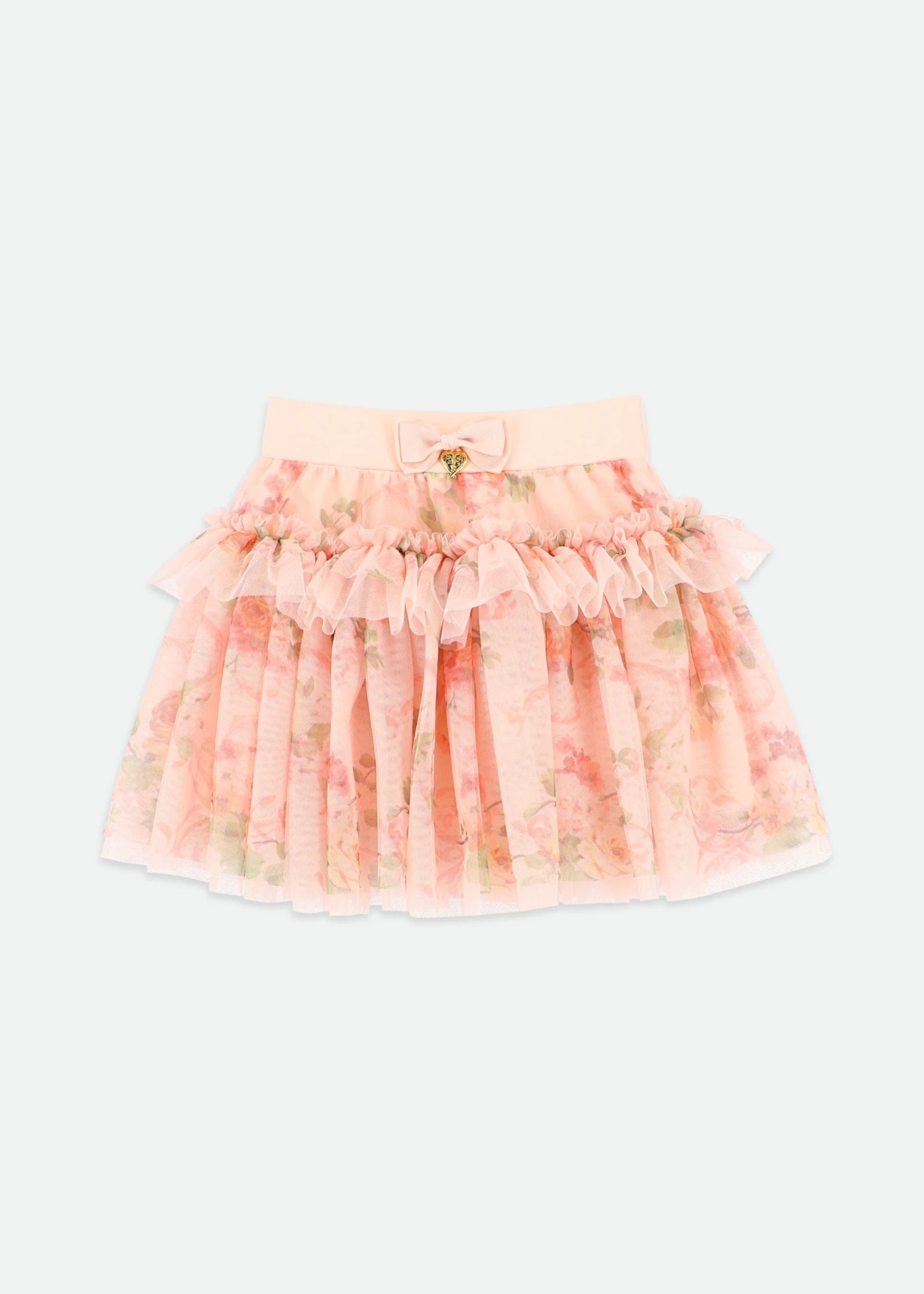 Stunning peach tulle skirt for girls. The voluminous floral printed tulle-tiered party skirt has a soft elasticated waist. Finished with a large grosgrain bow and signature gold heart charm. Fully lined with cotton blend. This skirt falls on the knee.