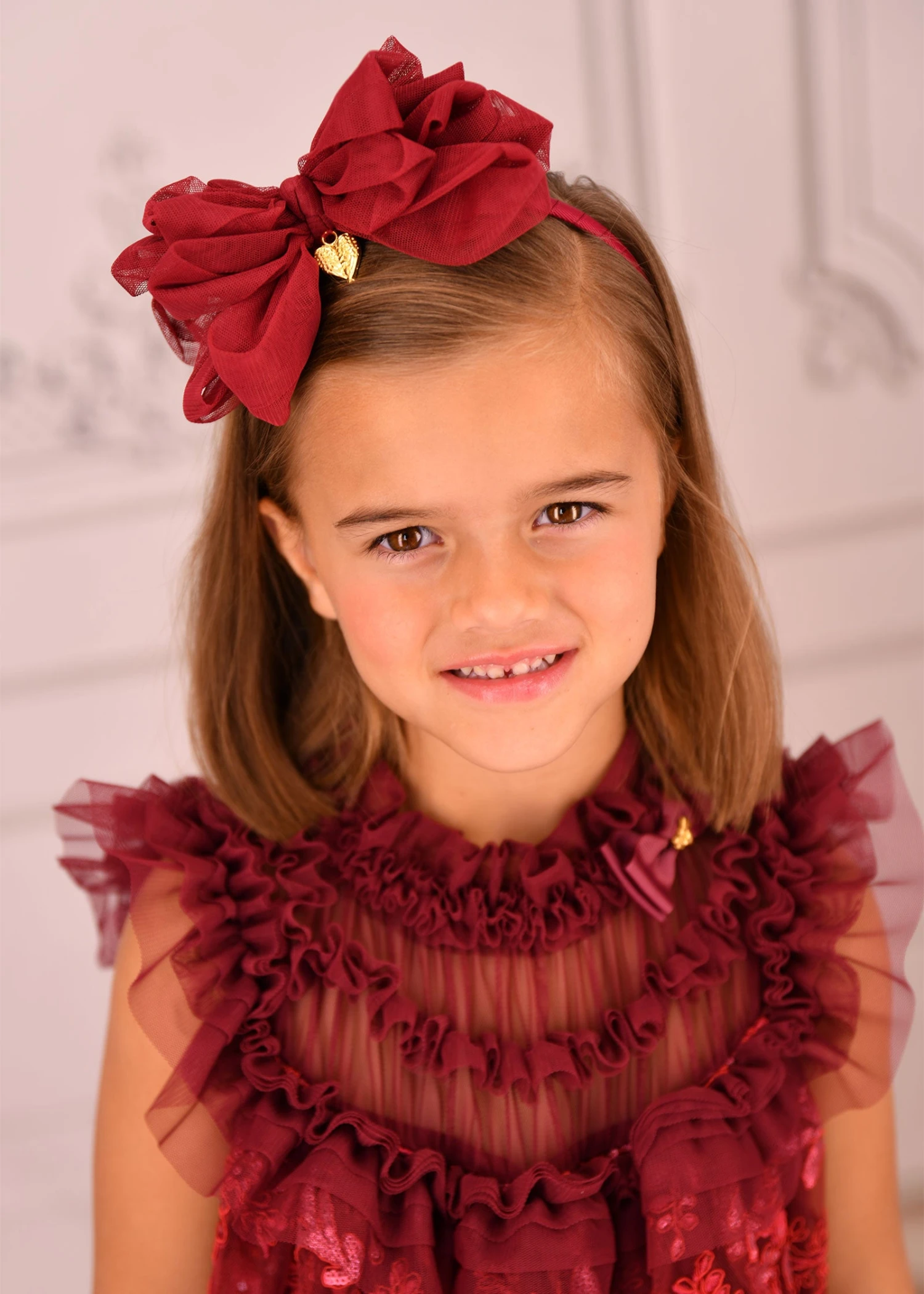 Decorative headband for girls in a deep red. This headband features a voluminous layered tulle bow to the side complete with our signature Angel’s Face gold heart charm. Perfect for special occasions.