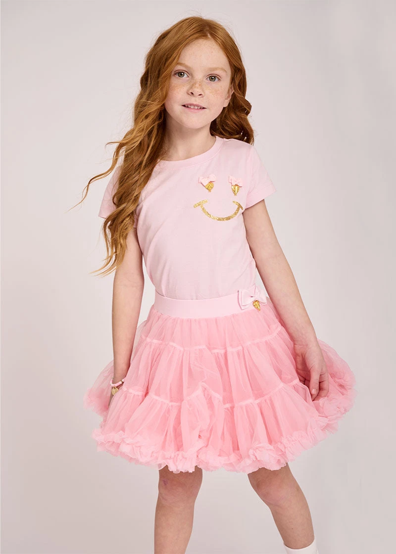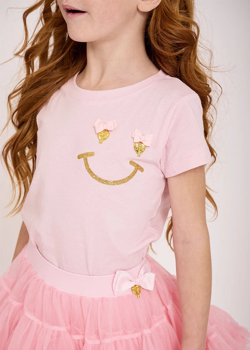 Playful summer t-shirt in fairy pink with a sparkling glitter smile and eyes made from our signature bow and gold heart charms. T-shirt is made from 100% cotton with a soft hand feel, designed with a casual easy fit.