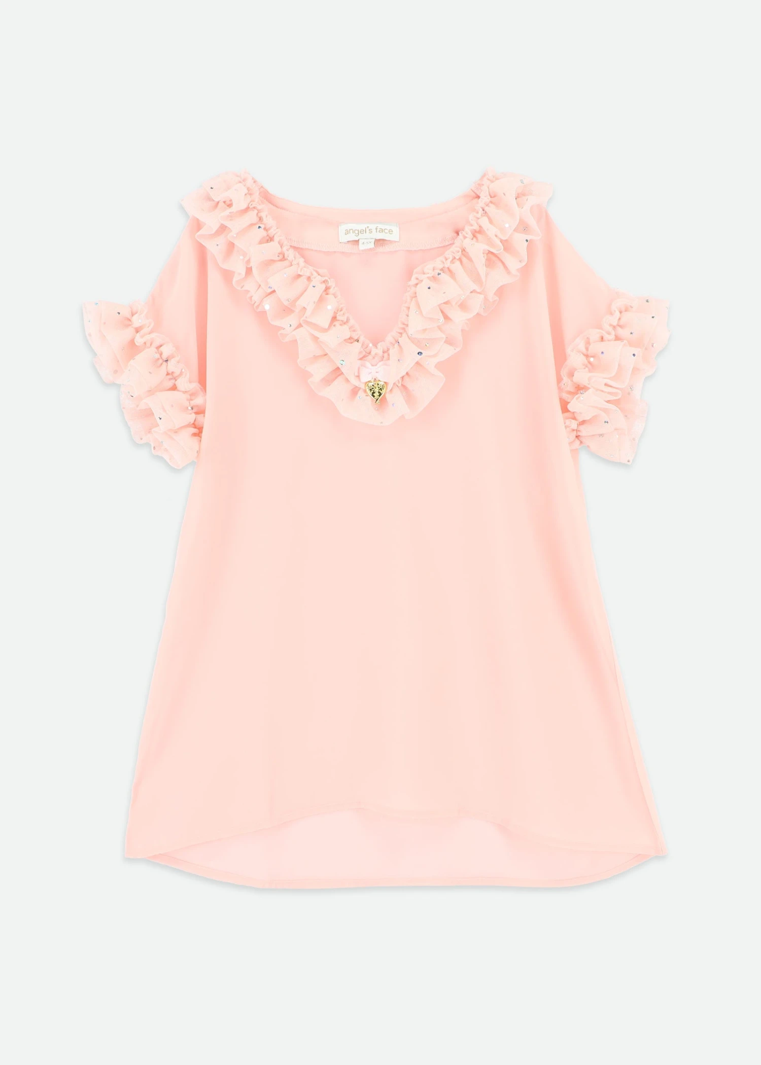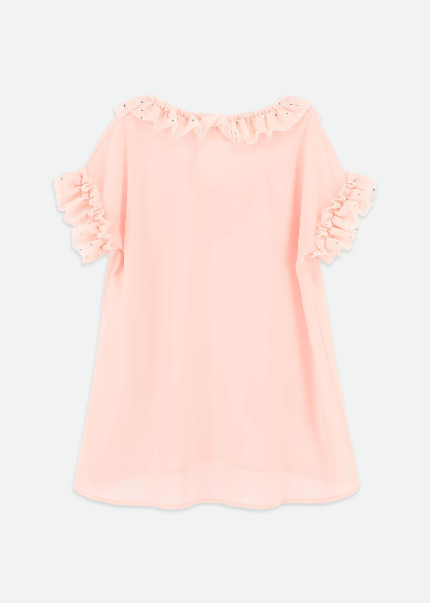 Glamorous girls summer kaftan in pale pink with sparkle finish The perfect swim coverup is light weight with short sleeves featuring soft tulle ruffles adorned with sparkle finish. Kaftan is complete with our signature bow and gold heart charm centre of the V neck opening.