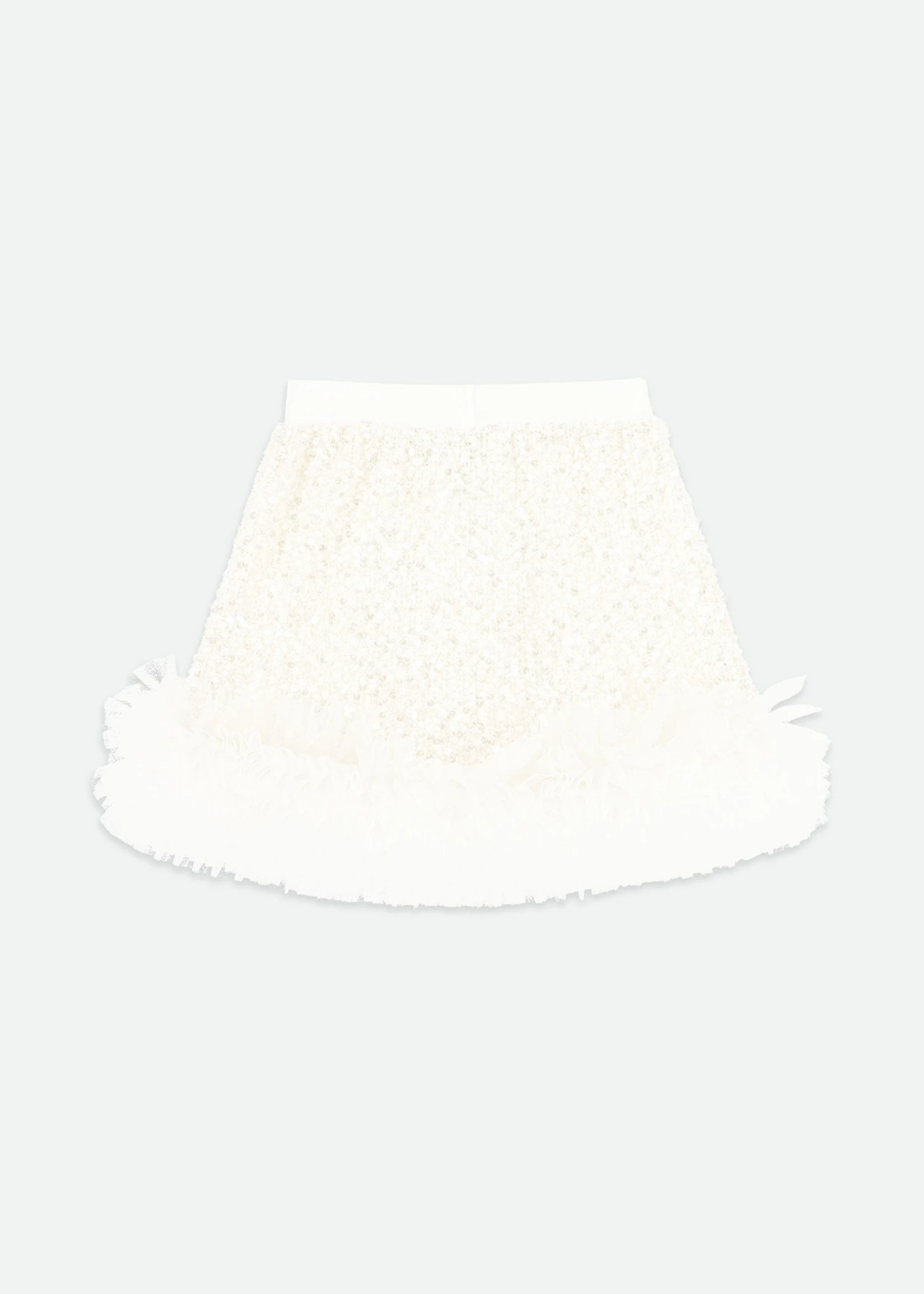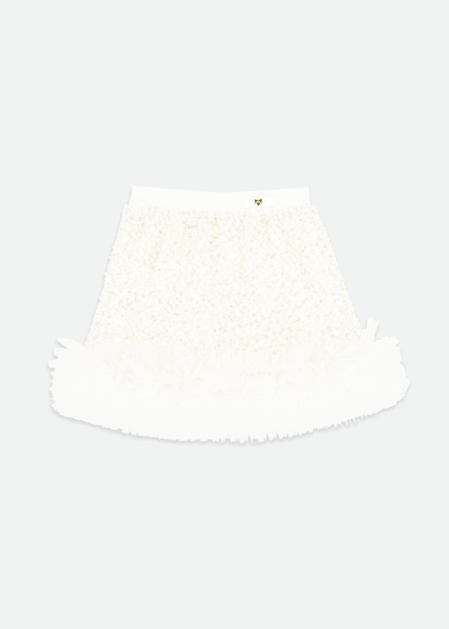 Make an entrance in this dazzling sequin skirt for girls. Covered in shimmering white sequins, this elegant skirt is finished with a soft and fluffy tulle hem that adds extra volume and movement. An elasticated waistband ensures a comfortable fit, while our signature gold heart charm and grosgrain bow detail adds a special touch. Fully lined in soft cotton for comfort, this statement piece is perfect for parties and special occasions.