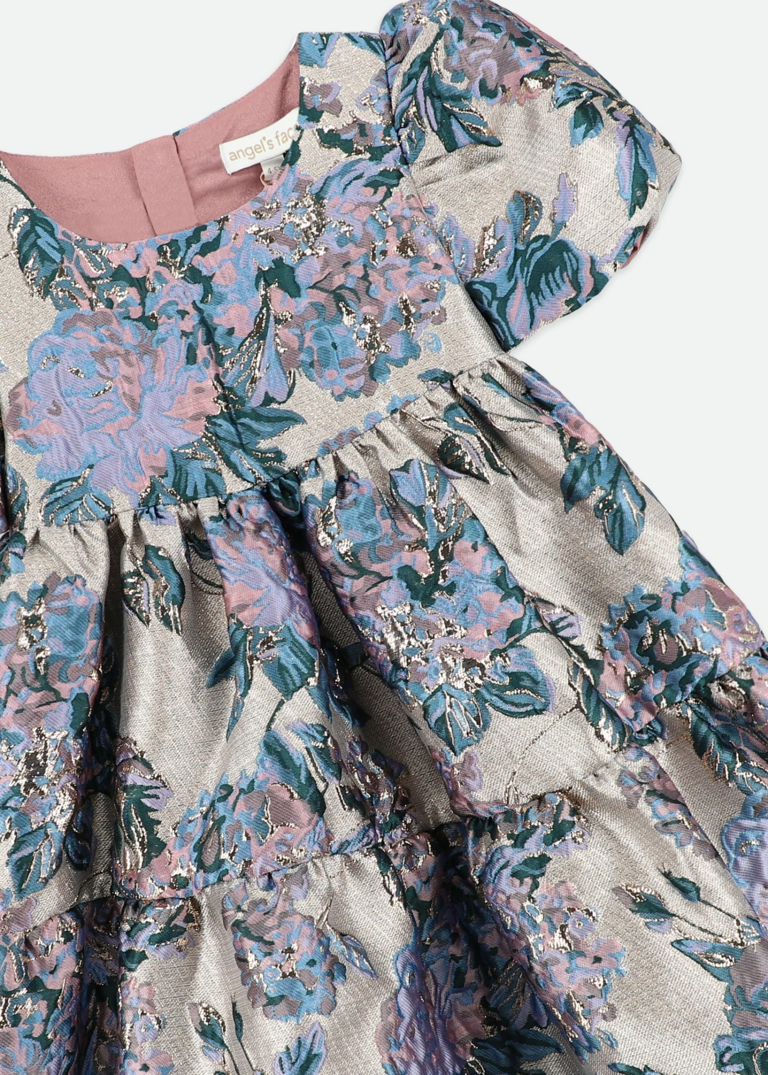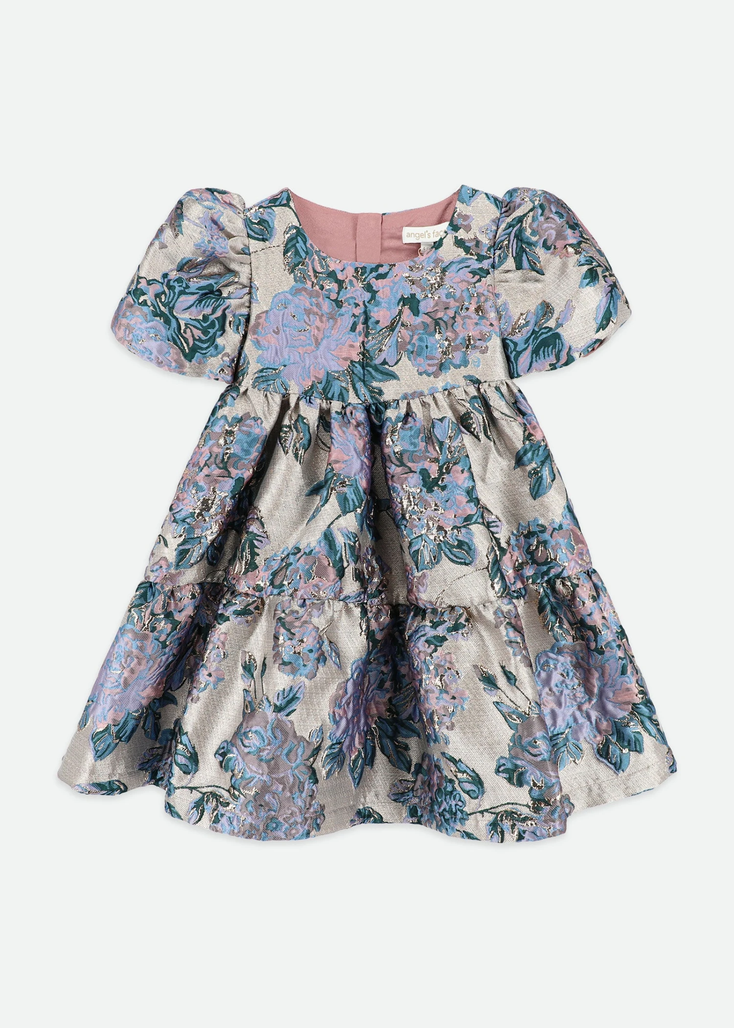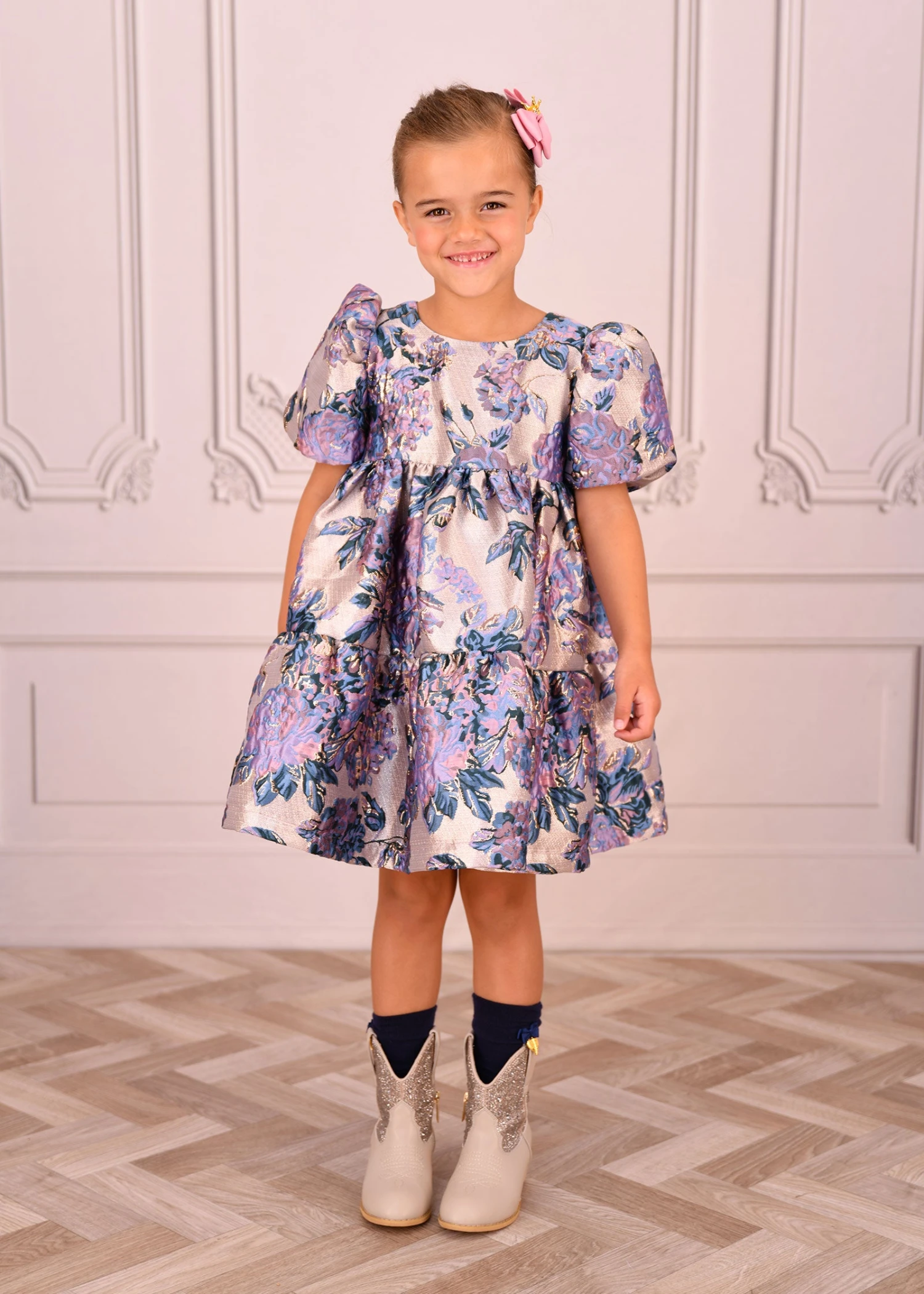 Make a statement in this beautiful floral jacquard dress for girls. Perfect for parties and special occasions, this elegant dress features shimmering metallic threads woven into a stunning lilac, blue, and green floral pattern. It has short puff sleeves and a tiered skirt for extra volume and twirl. Fully lined in soft cotton for comfort, with a gold zip fastening at the back for easy dressing.