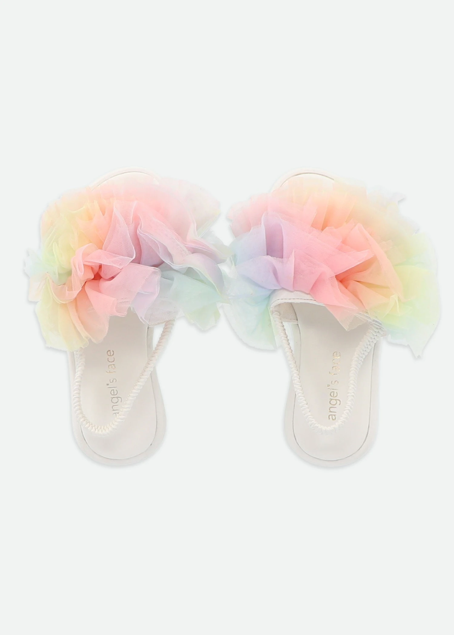 Stunning toddler white slider with rainbow tulle ruffle detail. This slider has a velcro strap on the front and a elasticated strap at the back for easy wear. Features chunky rubber soles for extra grip and a soft cushioned interior adding comfort.