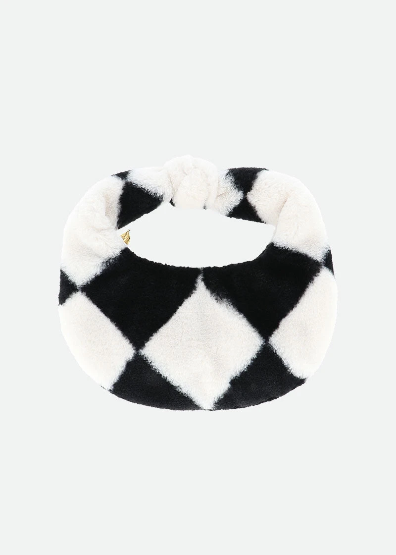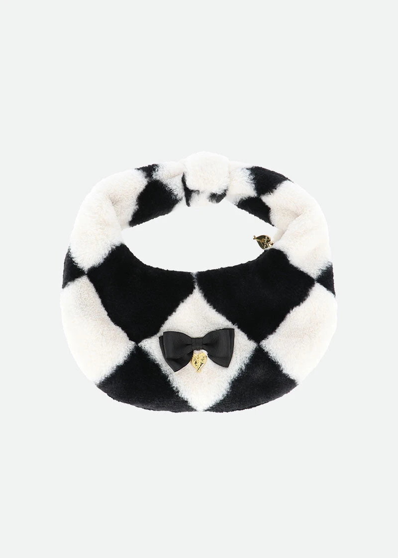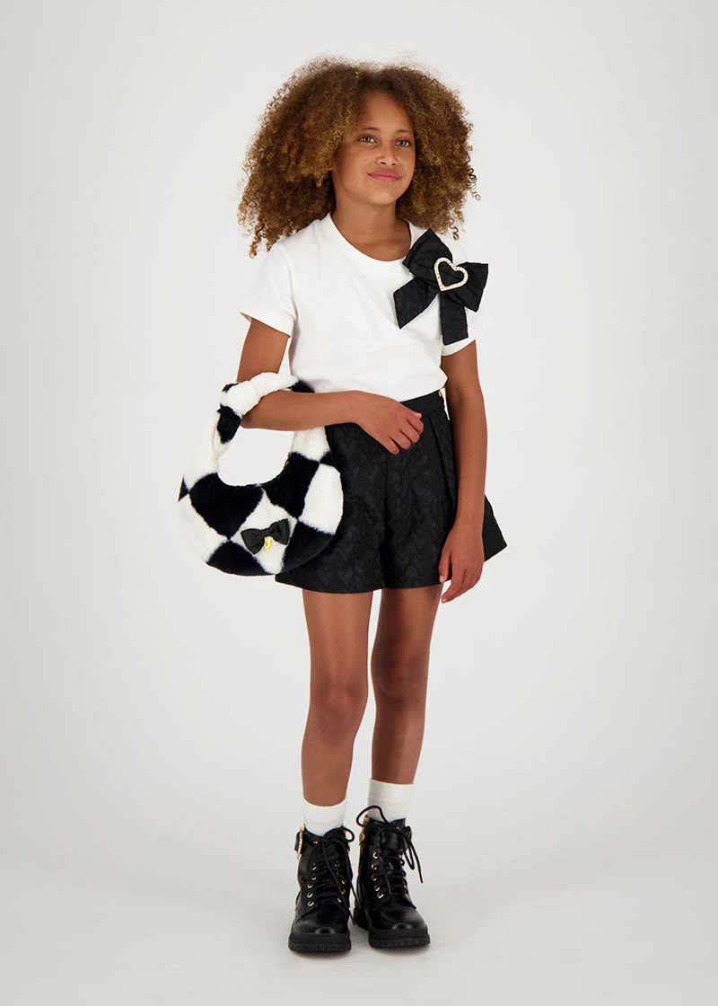 Glamorous faux fur girls black and white handbag. Luxouriosly soft diamond printed fur bag featuring a bright print satin lining. Perfect for keeping small essentials secure fastening along the top with our iconic gold zipper. Bag is complete with our signature bow and gold heart charm on the front.