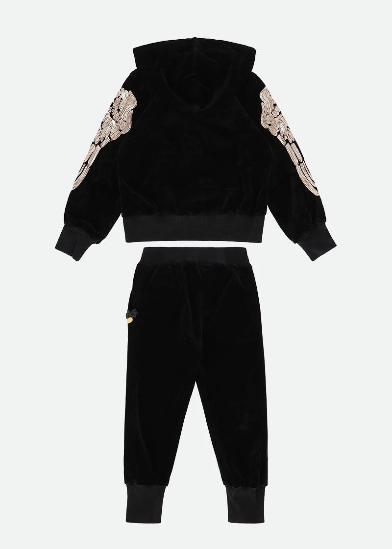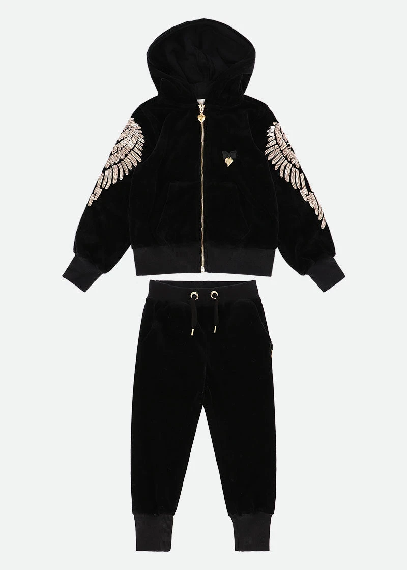 Luxurious soft cotton velour tracksuit featuring our iconic Angel’s Face wings on the sleeves. Tracksuit has a lined hood and comfortable rib around the cuffs and waist. The set is complete with our shiny gold heart zipper down the front, golden eyelets with a secure drawstring and our signature bow and hold heart charm on the chest and side pocket