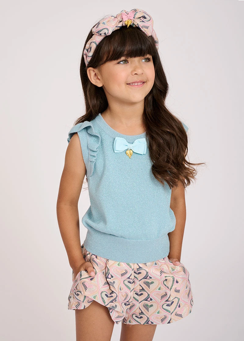 Tea rose hearts pattern hairband. Made from soft polyester jacquard in a tie knot design, the headband features our signature bow and gold heart charm.