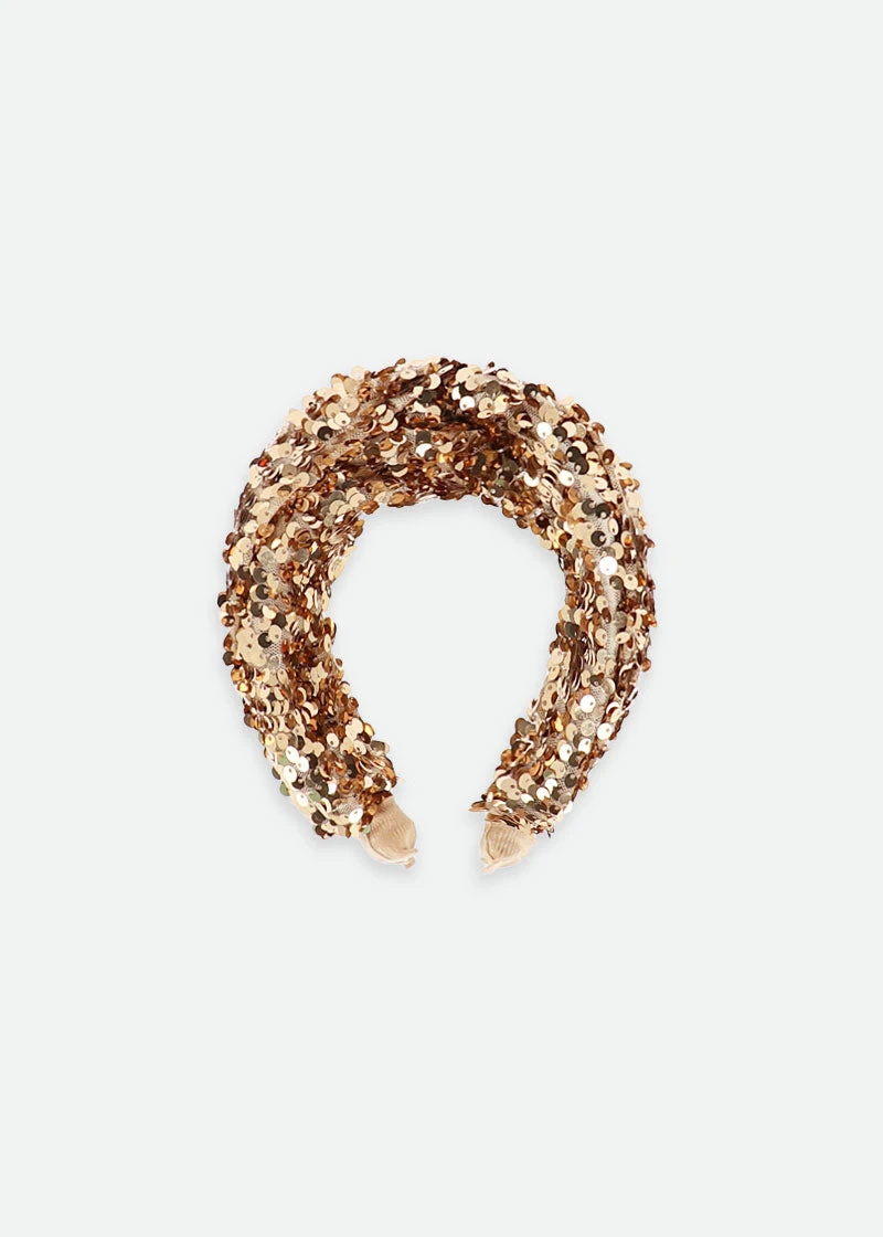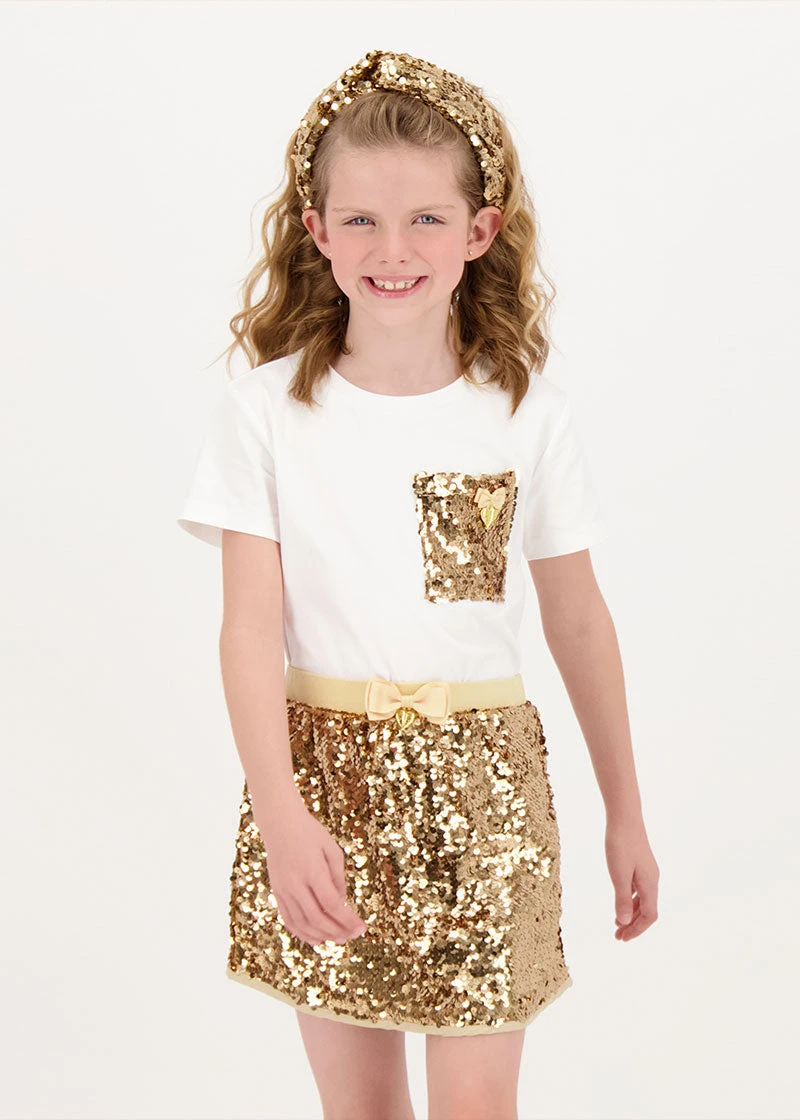 Girls headbands made with sparkling sequin fabric and completed with our signature bow and gold heart charm.