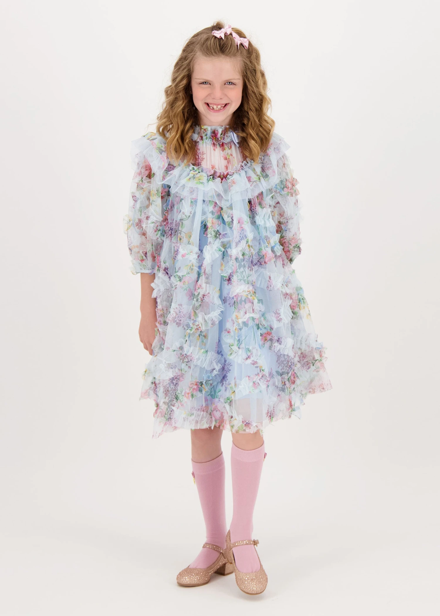 Make an entrance in this voluminous blue tulle party dress for girls. The luxurious tulle dress is detailed with this season’s exquisite flower design, fully lined in a soft stretch cotton blend. Three-quarter sleeve, frills at the neck yoke and skirt. The dress is complete with our signature bow and gold heart charm on the neckline, fastening at the back with a gold button.