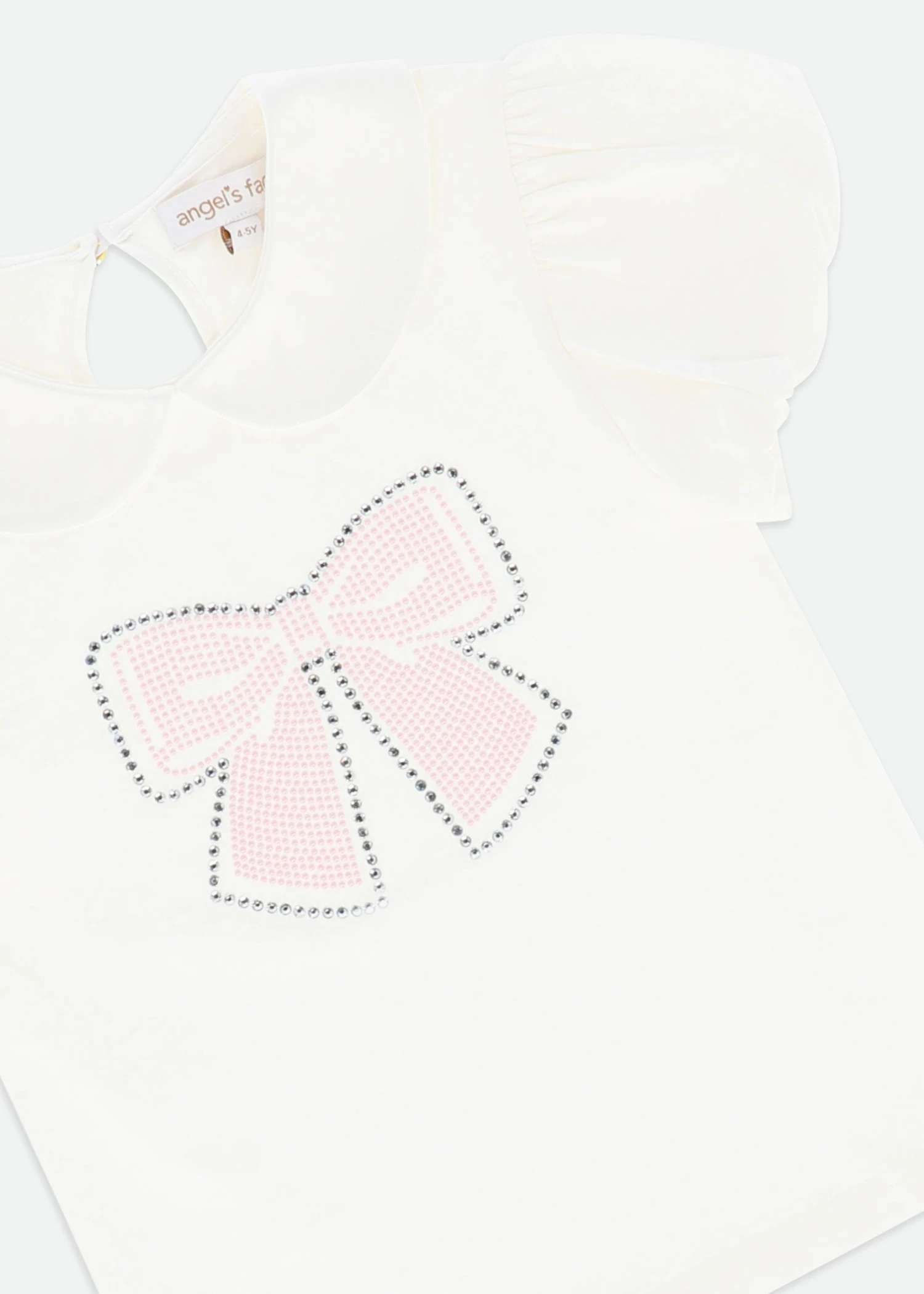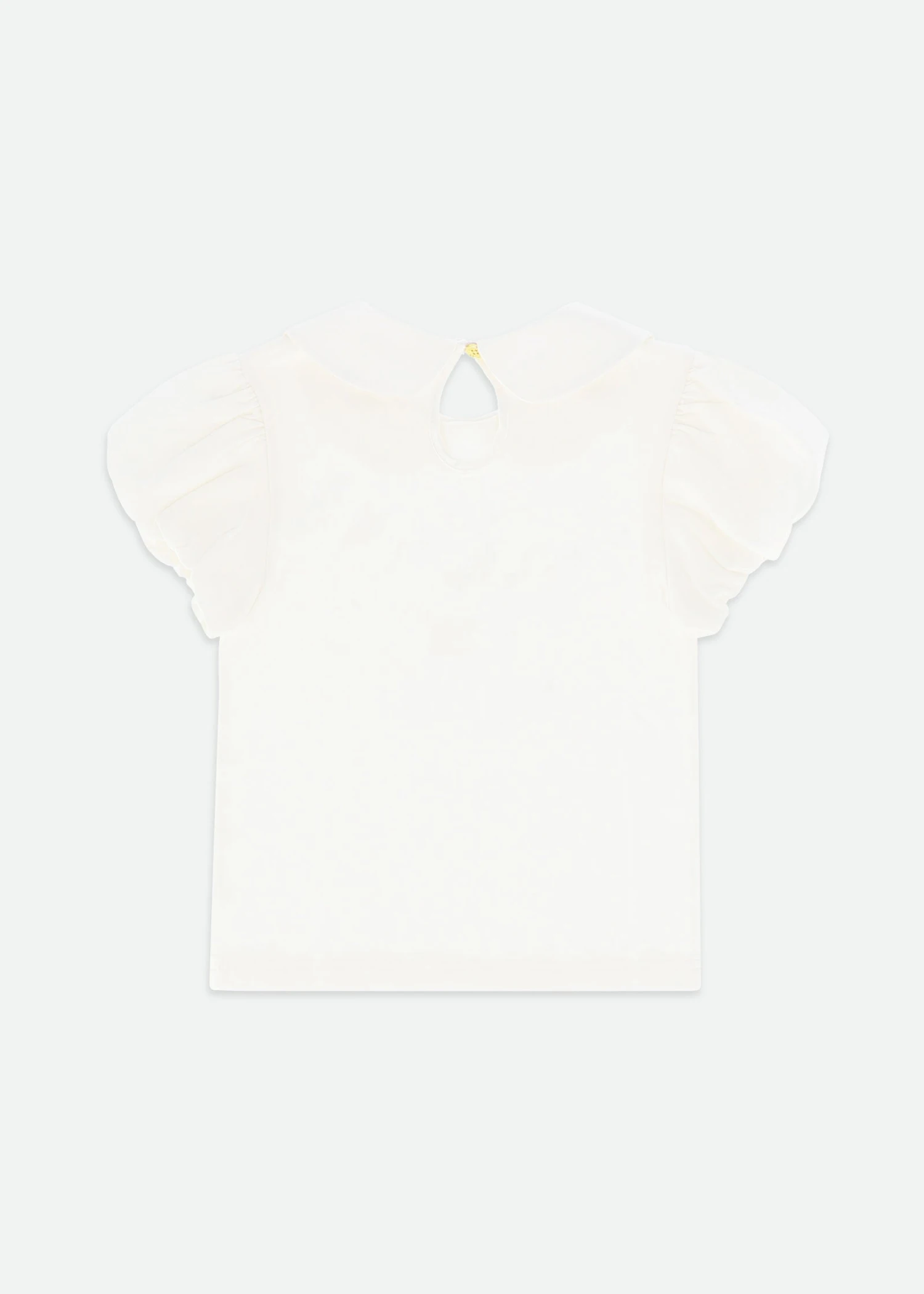 Luxury top with posh satin collar and diamanté heart in snowdrop white. The top is detailed with a contrast white satin collar, voluminous puffed sleeves and pretty bow diamanté embellishment on the front. Fastens at the back with gold logo button.
