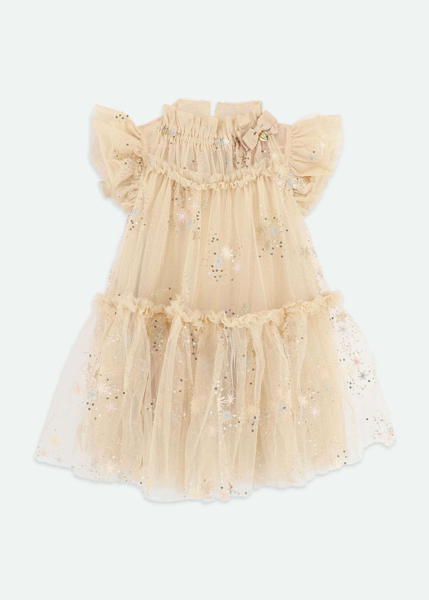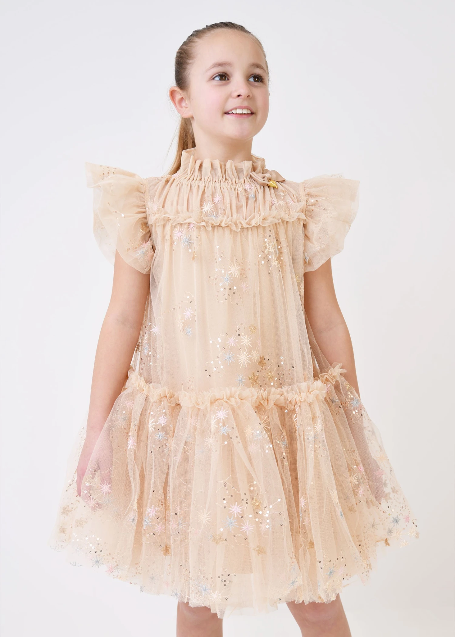 Gorgeous gold glitter star dress for girls. The dress is made from voluminous soft tulle, fully lined in soft cotton. Detailed with our signature bow and gold heart charm on the neckline, fastening at the back with a gold logo button.