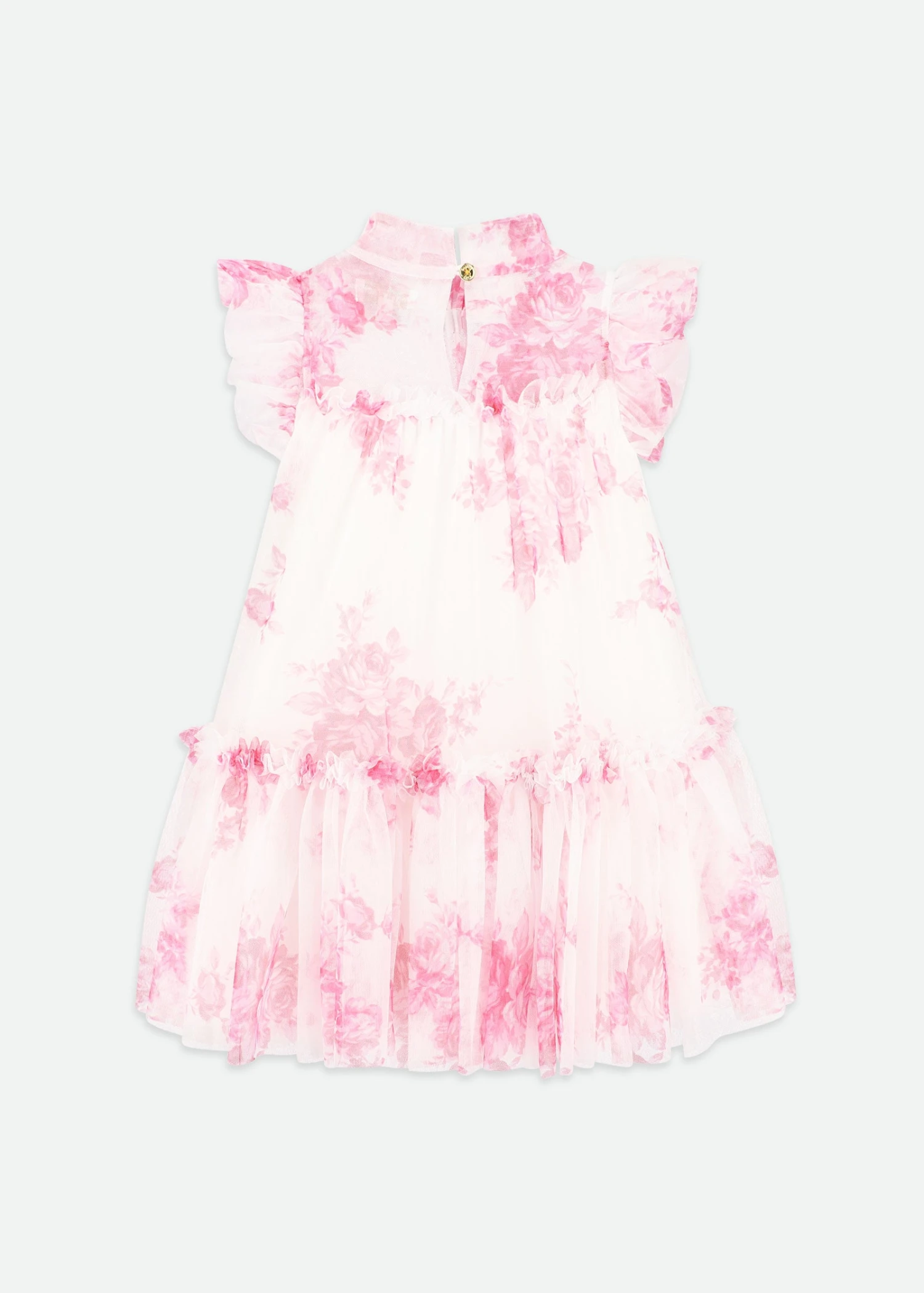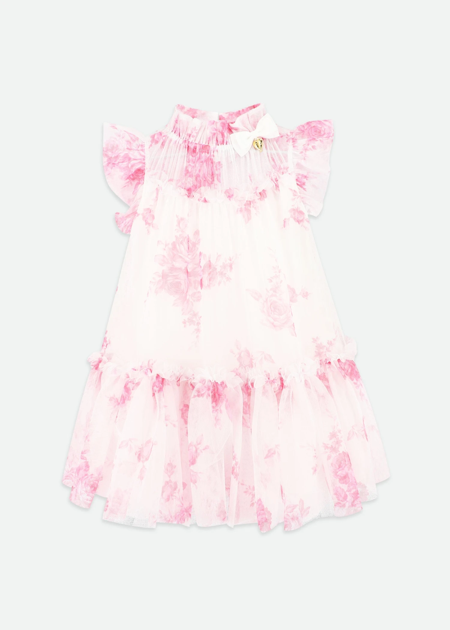Gorgeous pink and snowdrop rose printed summer dress for girls. The dress is made from voluminous soft tulle, fully lined in soft cotton. Detailed with our signature bow and gold heart charm on the neckline, fastening at the back with a gold logo button.